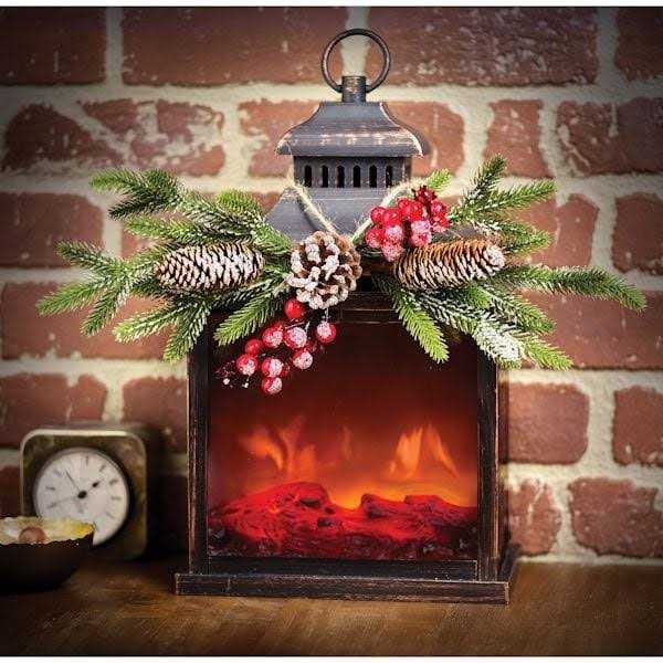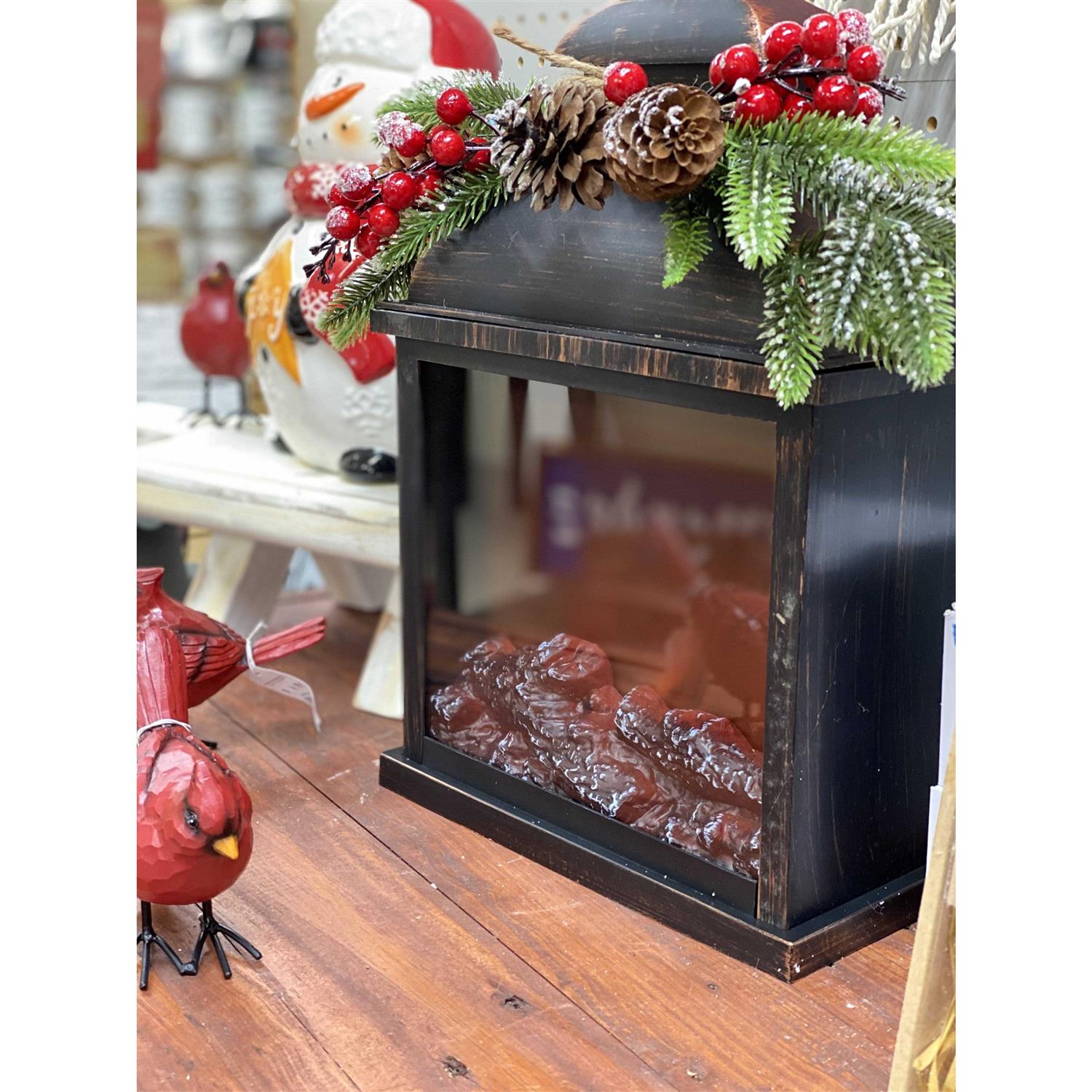 This mini fireplace lantern uses safe LED lights to create the illusion of a roaring fireplace complete with glowing fireplace logs and embers, but it stays cool, so you can safely place it anywhere. It’s perfect for homes with small children and pets and areas where open flames are not permitted, like offices, apartments, and dormrooms. The antiqued finish lantern is decorated with faux greens, frosted pine cones, and berries to make it even more festive. The little lantern makes for a pretty centerpiece for your holiday table. Use 3 – C batteries (not included). Measures 10 inchw x 17 inchh x 5 inchd.