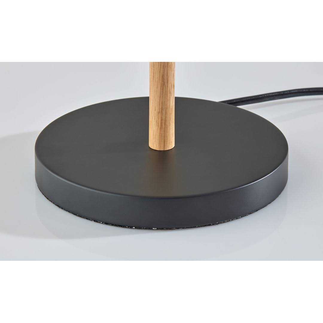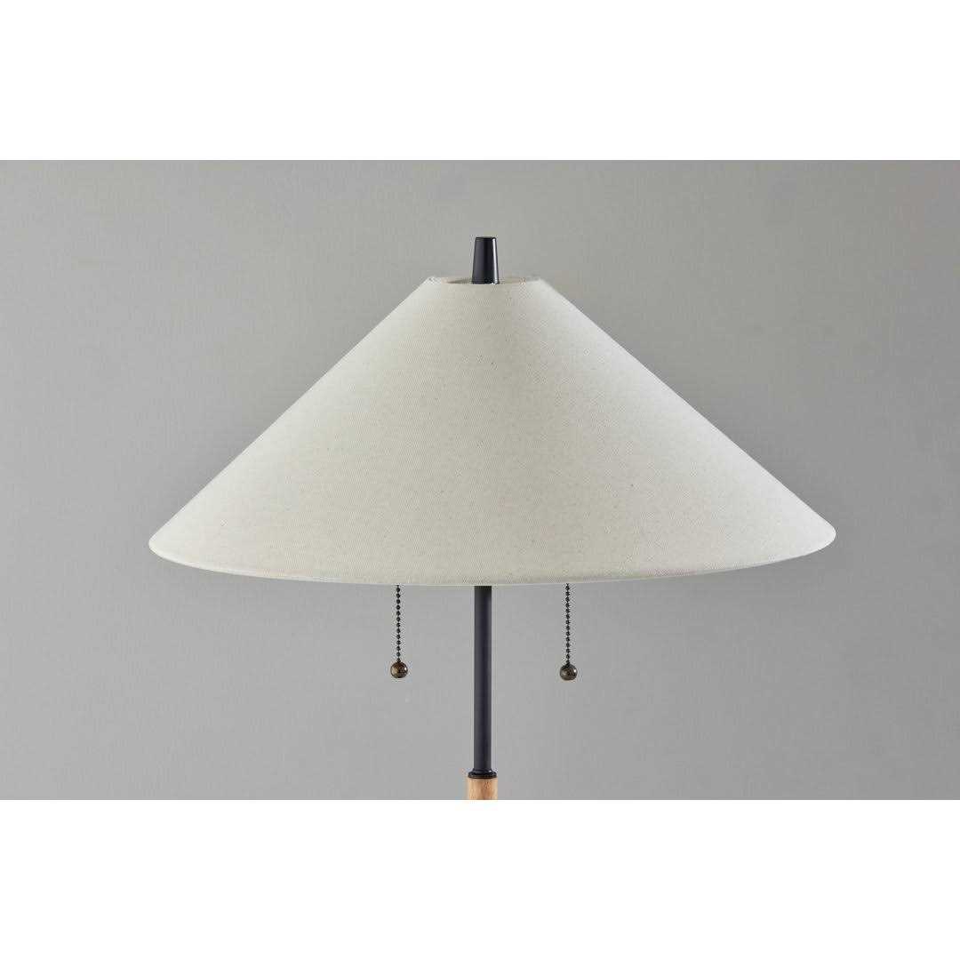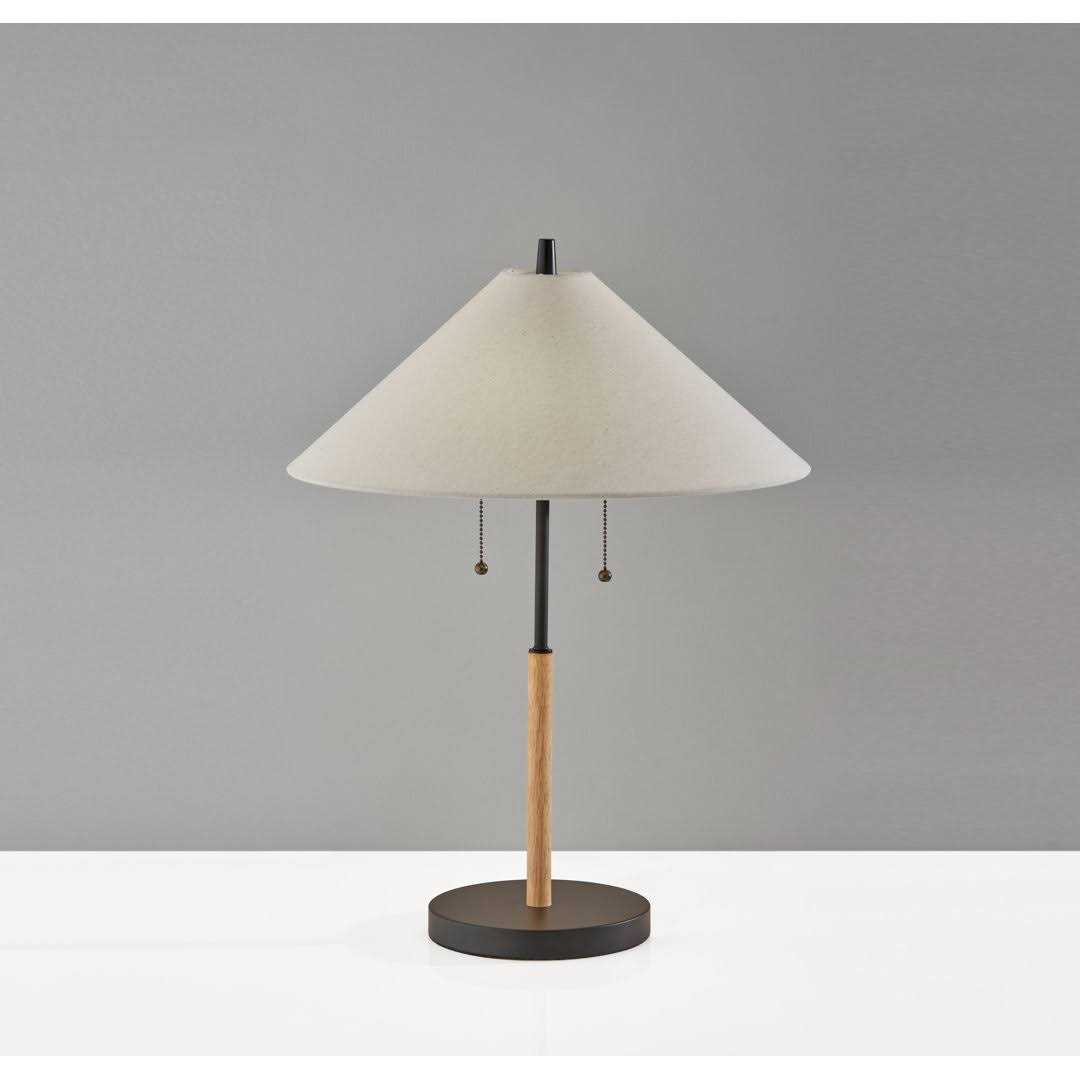 Embrace the mixed materials trend with the contemporary style of the Florina table lamp. With its blend of metal and wood materials and complementing black with walnut and natural finishes, this lamp is the perfect style choice for nightstands, desks, end tables, and accent tables. Featuring clean style lines, a round black metal base supports a thin stem in a rich, walnut, and natural finish that transitions back to black metal. Topping the Lamp is a retro-inspired lampshade that maintains a minimal aesthetic. The white and light brown textured fabric shade softly diffuses light from two 40W bulbs for a warm glow. Operated by dual pull chain switches, the lamp is also powered by a coordinating 5′ black cord. For a striking, contrasting look, the Florina table lamp is also available with a blend of black metal and natural wood finishes complemented by a white and light brown textured fabric shade. Complete your space’s decor with the coordinating Florina floor lamp.