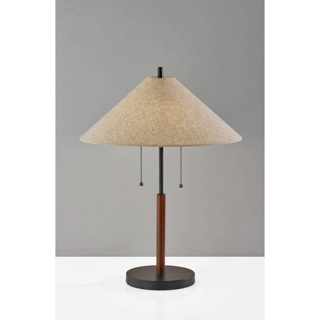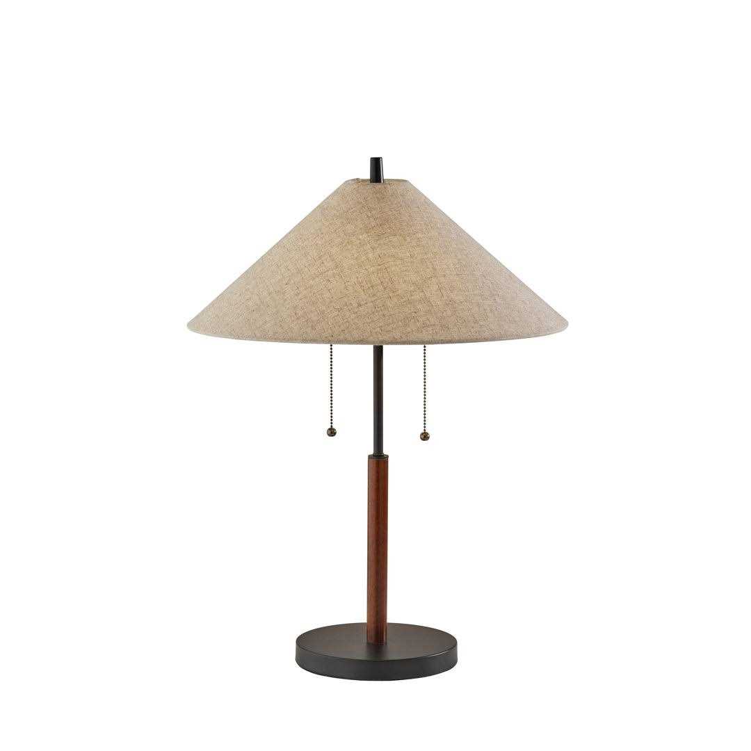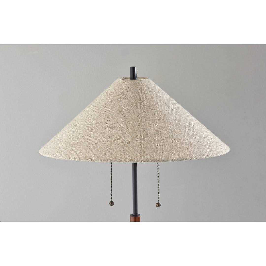 Embrace the mixed materials trend with the contemporary style of the Florina table lamp. With its blend of metal and wood materials and complementing black with walnut and natural finishes, this lamp is the perfect style choice for nightstands, desks, end tables, and accent tables. Featuring clean style lines, a round black metal base supports a thin stem in a rich, walnut, and natural finish that transitions back to black metal. Topping the Lamp is a retro-inspired lampshade that maintains a minimal aesthetic. The white and light brown textured fabric shade softly diffuses light from two 40W bulbs for a warm glow. Operated by dual pull chain switches, the lamp is also powered by a coordinating 5′ black cord. For a striking, contrasting look, the Florina table lamp is also available with a blend of black metal and natural wood finishes complemented by a white and light brown textured fabric shade. Complete your space’s decor with the coordinating Florina floor lamp.