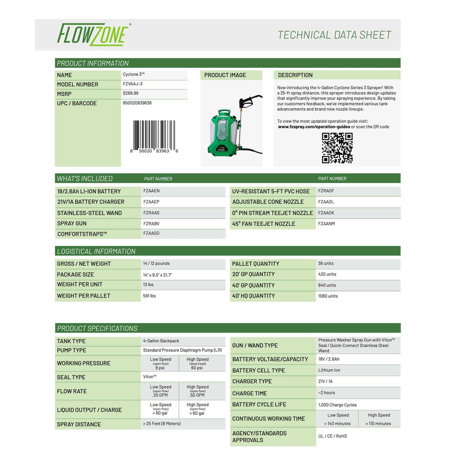 This durable sprayer is built to withstand the demand of regular use and a variety of chemicals. The Cyclone 3 is equipped with an industry-leading five-setting variable pressure control dial. A crowd favorite, the Cyclone 3 is a powerful tool capable of pressures up to 60 psi. With a battery life of up to two hours and a 30-ft spray distance, the Cyclone Series 3 is a premier choice in the pest control and lawncare industries. The Cyclone Series 3 will make it easier and quicker to spray. FlowZone Cyclone Series 3 introduces design updates that lead to an even better spraying experience!