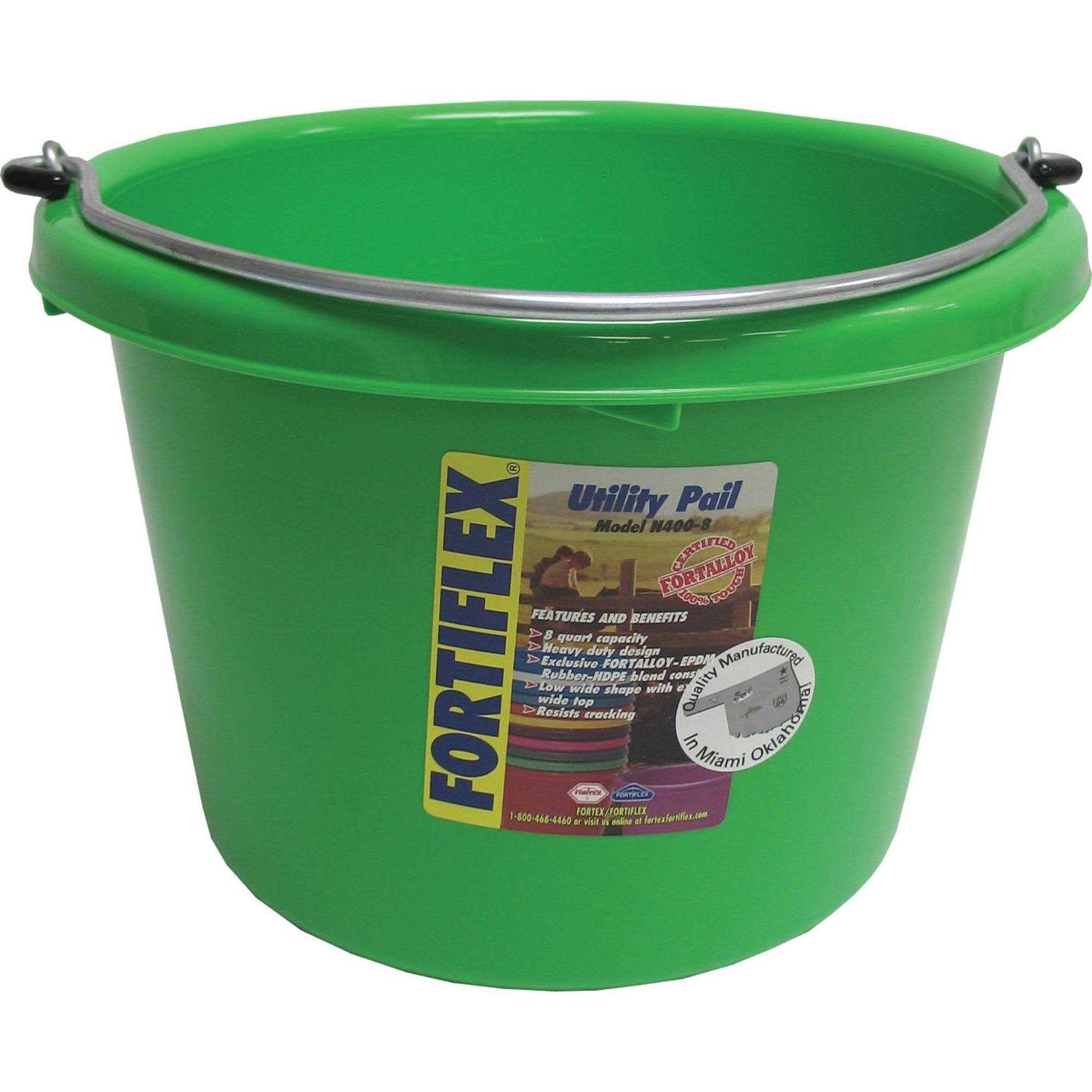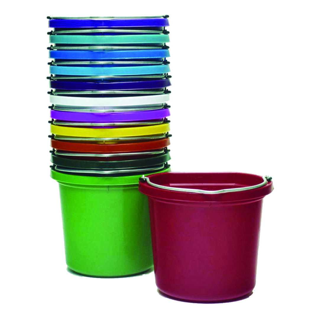 Fortiflex 8 quart buckets are a great small pail for grooming supplies, bathing horses, washing brushes, organizing tools or general household use. Their compact size makes them handy for traveling. They can also work as water bowls for dogs and other small pets. Available in round or flat back styles. Great gift basket idea with the brigh color choices and custom decal options.