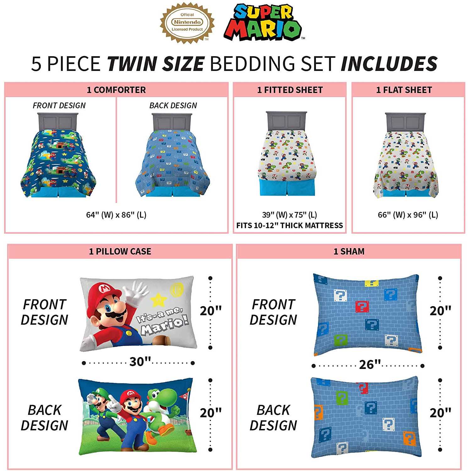 Super Soft Easy Care Children’s Bed In A Bag: Crafted For Comfort, The Microfiber Material Is Super Soft And Long Lasting, Keeping Kids Warm And Cozy All Night Or While Camping. This High-quality Bed Set Is An Enduring Choice That’s Sure To Become A Favorite. You Can Throw The Bedsheets And Comforter Into The Washer And Dryer Without Worrying About The Colorful Themed Pattern And Animated Cartoon Characters Fading. The Material Is Wrinkle-resistant, Making It A Great Choice For Any Child’s Bedroom Or Nursery As A Home Decor Accessory. 7 Piece Full Size Complete Linen Set Includes: 1 Fitted Sheet 54″ (W) X 75″ (L) Featuring Deep Pockets, Fits 10-12″ Thick Mattress. 1 Flat Sheet 81″ (W) X 96″. (L) 2 Standard Pillow Cases 20″ X 30″. 2 Pillow Shams 26″ X 20″. 1 Reversible Comforter 76″ (W) X 86″ (L). Designed To Fit A Standard Full Size Bed. Super Mario Design: Level Up His Bedroom Decor With Colorful Bedding Featuring Mario, Luigi, Yoshi And Toad From The Popular Nintendo Video Game Super Mario. The Bold And Energetic Style Of Nintendo’s Iconic Super Mario Game Comes Through In The Vibrant Artwork And Colors Of This “Plumber Mario” Patterned Bedding Set In Shades Of Blue And Grey. Two Designs In One Comforter: The Game Never Ends With This Reversible Comforter. One Side Features Character Imagery Of Mario, Luigi, Yoshi And Toad On A Dark Blue Background. When It’s Time For The Next Level, Flip It Over To Reveal A Fresh All-over Question Block Print On A Lighter Blue Background. 5 Piece Twin Size Complete Linen Set Includes: 1 Fitted Sheet 39″ (W) X 75″ (L) Featuring Deep Pockets, Fits 10-12″ Thick Mattress. 1 Flat Sheet 66″ (W) X 96″ (L). 1 Standard Pillow Case 20″ X 30″. 1 Pillow Sham 26″ X 20″. 1 Reversible Comforter 64″ (W) X 86″ (L). Designed To Fit A Standard Twin Size Bed.