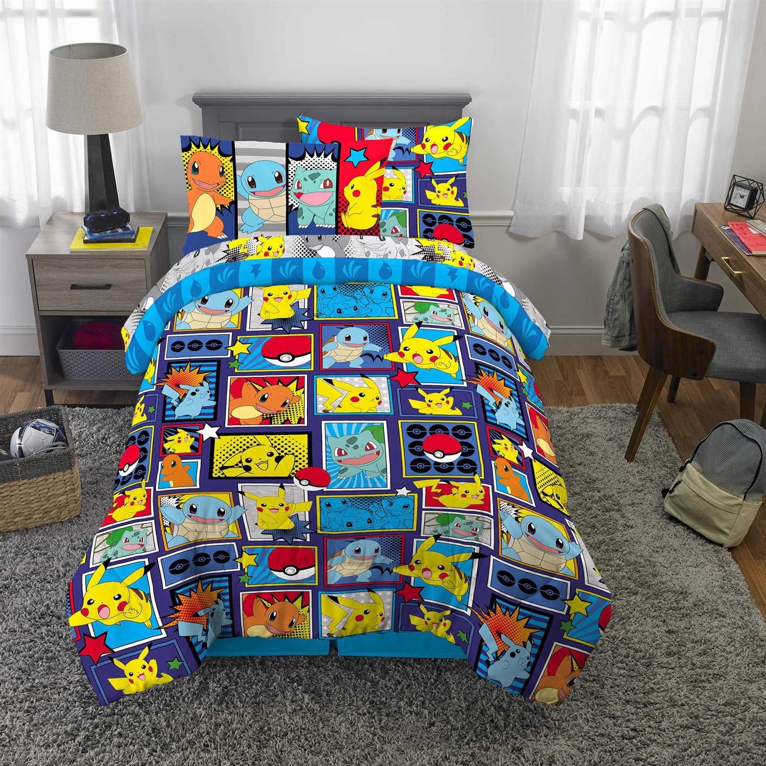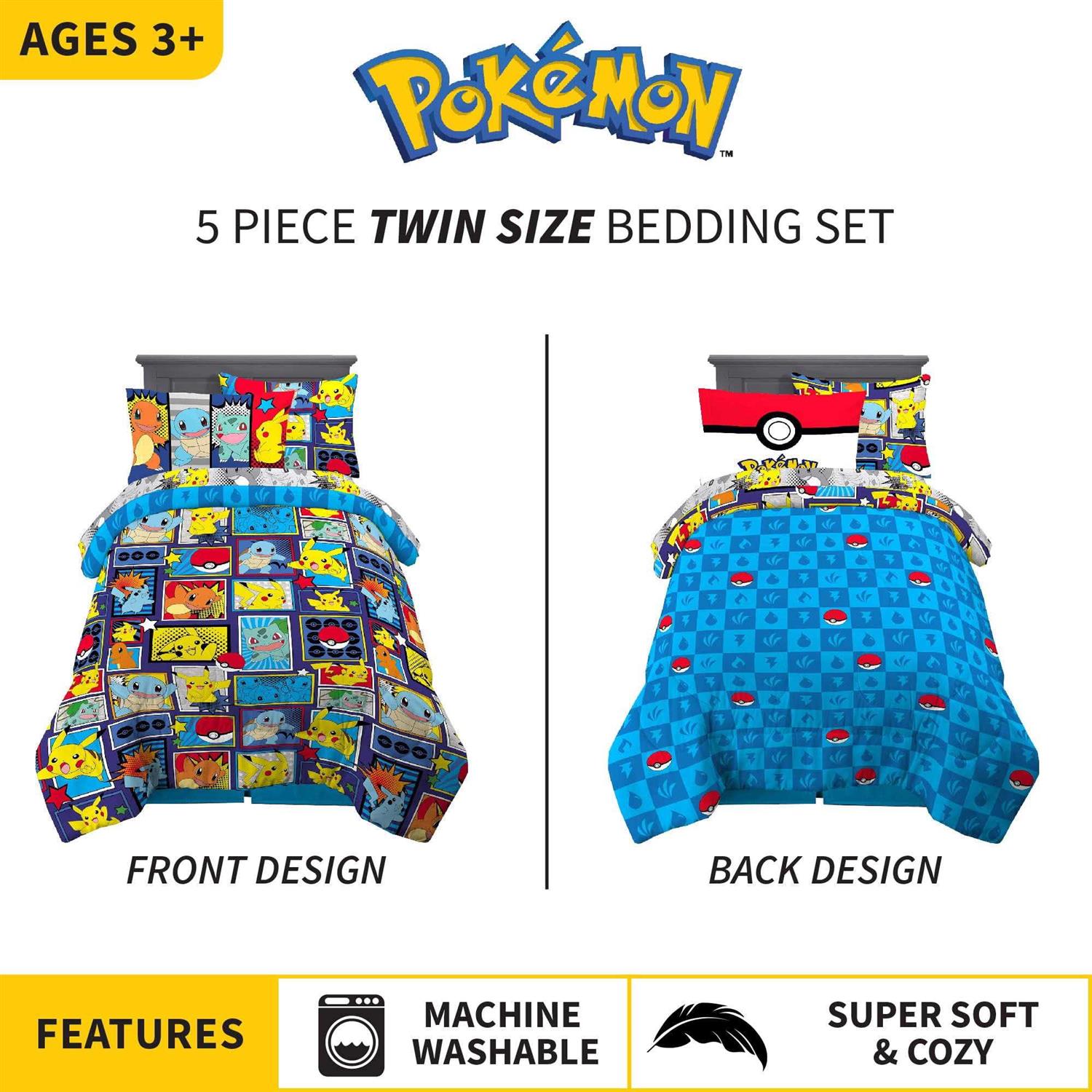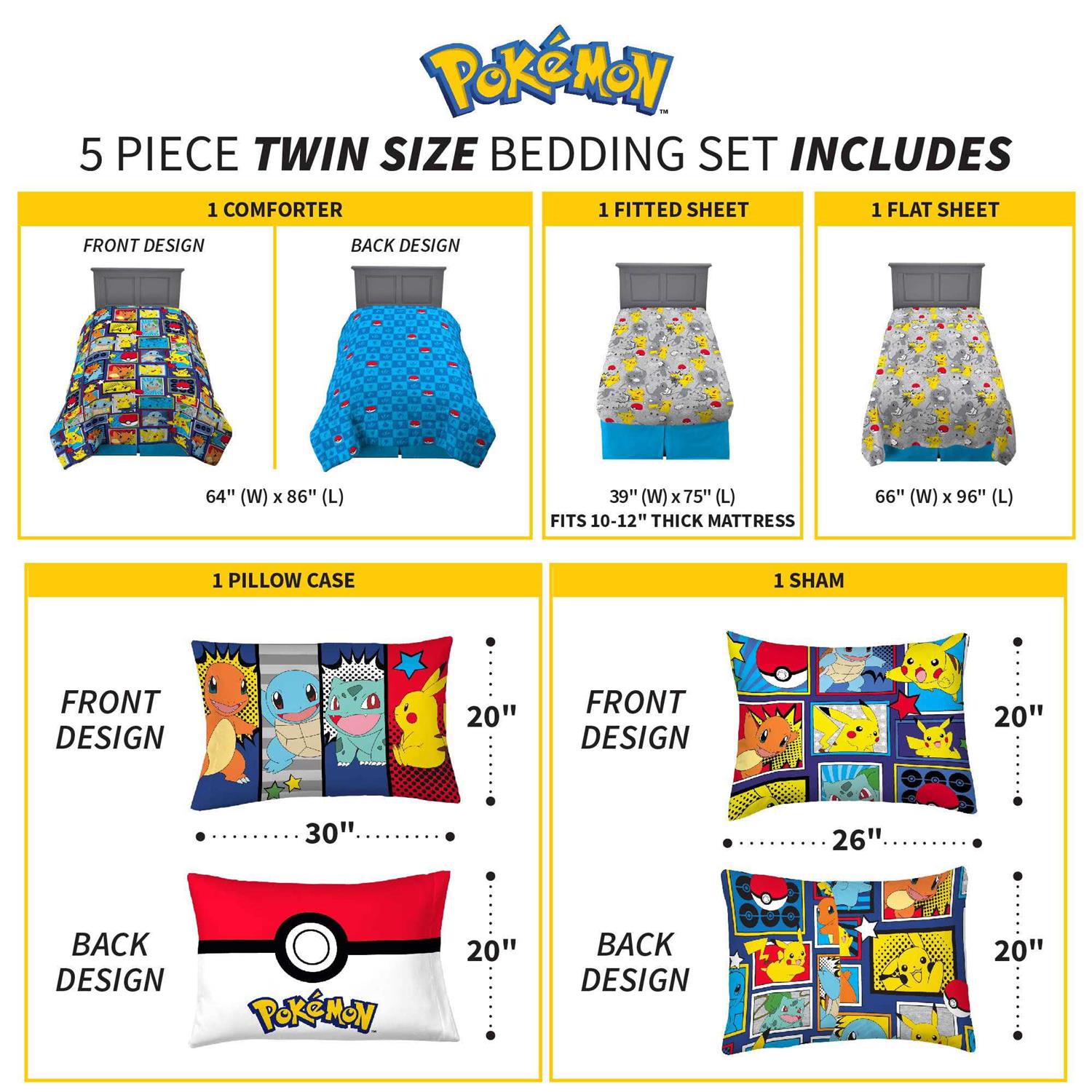 Pokémon trainers will be ready for any bedtime battle with this eye-catching bedding set featuring some of their favorite characters from the hit animated series. Pikachu, Charmander and Squirtle bring their fun and friendly style to this “Pokémon Comics” patterned bedding. This high-quality microfiber set includes a comforter, fitted sheet, flat sheet, pillowcase(s) and pillow sham(s). The reversible comforter features dynamic comic-book style artwork of Pikachu, Charmander and Squirtle leaping into action against a dark blue backdrop on one side, while a Pokeball and Pokémon-type symbol print changes things up on the lighter blue reverse side. Coordinating colors and character imagery on the rest of the “Pokémon Comics” patterned sheets, pillowcase(s) and sham(s) help to create a cohesive Pokémon look. For decades, the Pokémon Universe has captured the imaginations of collectors and fans of all ages. Now young Pokémon trainers can catch ’em all while also catching a few Z’s in this soft and stylish Pokémon bedding set. Set is available in a twin size 5 piece bedding set or a full size 7 piece bedding set.