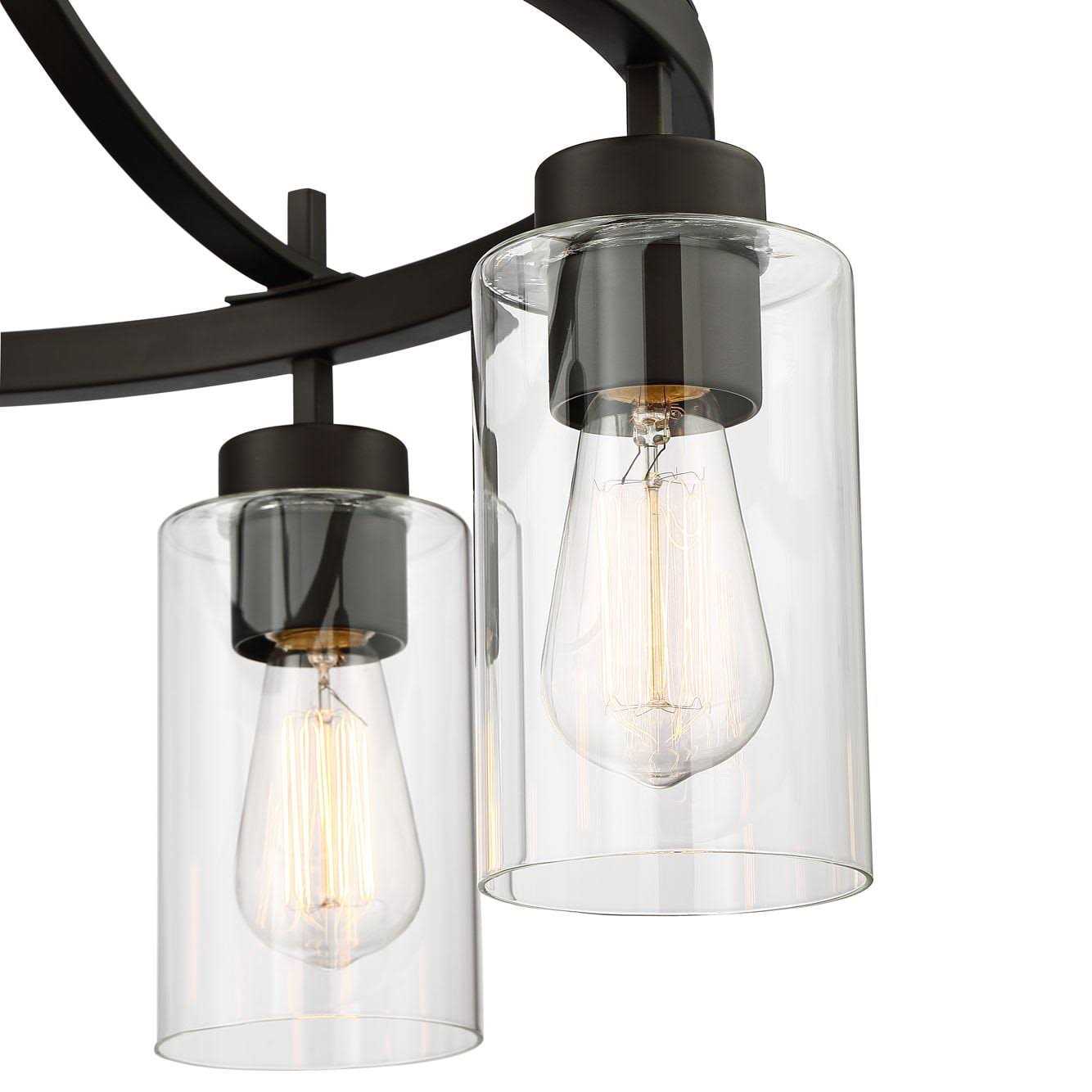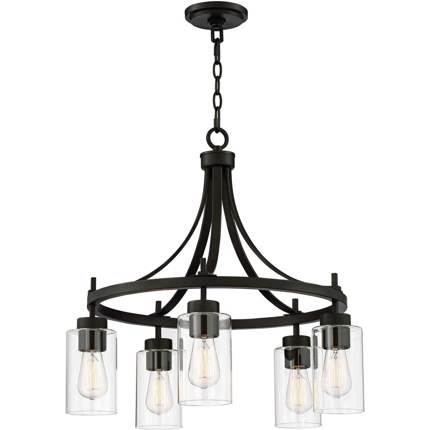 This chandelier lights up a dining room or entryway with inviting style. It boasts an industrial-inspired profile, with inverted clear glass hurricane shades hanging from a bronze finish frame. Clean lines and elegant simplicity make this bronze five-light chandelier a striking addition to casual contemporary decor. Best used with vintage-style light bulbs (not included). Color: One Color.