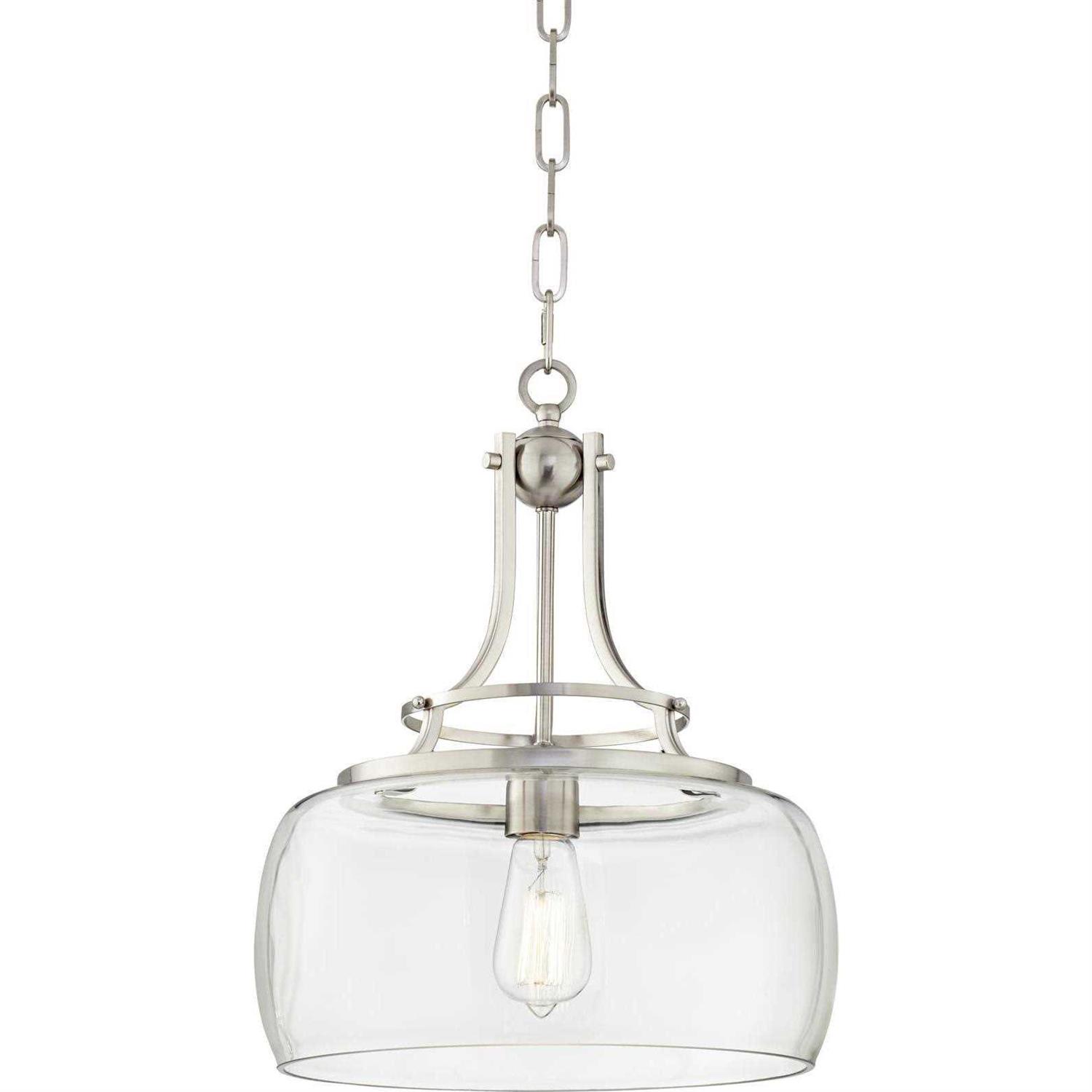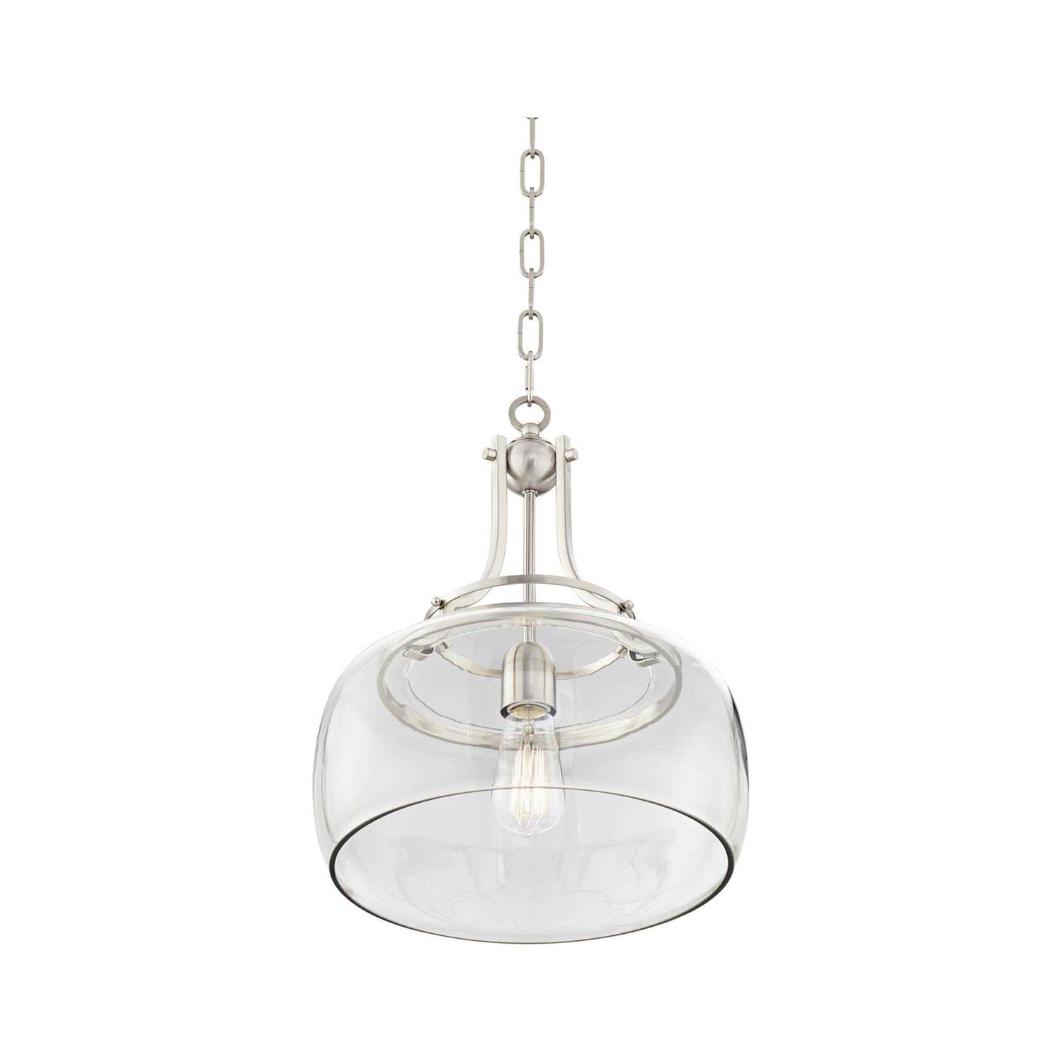 This Franklin Iron Works design offers a modern interpretation of a classic urban-industrial style. It comes in a brushed nickel finish and features a prominent round clear glass shade. The mouth-blown glass has a few pinprick bubbles that add to the vintage look and feel. As an added bonus, this pendant light comes with an energy-efficient LED light bulb in a classic Edison style that’s sure to add a nostalgic glow.