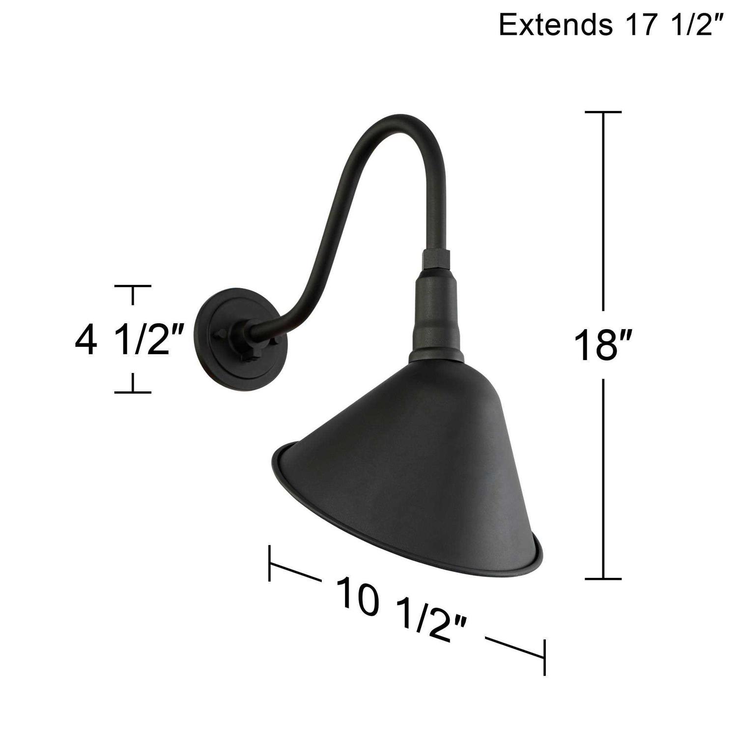 This outdoor wall light is sure to improve the look of any home’s exterior. A simple design with a curving downward arm and flared shade creates a farmhouse appeal. The black finish blends well with a variety of existing decor and color schemes. The design is inspired by classic RLM (reflector luminaire manufacturer) lighting, which uses a reflector shade to direct light downward. 18″ high x 10 1/2″ wide. Extends 17 1/2″ from the wall. Backplate is 4 1/2″ wide. Weighs 2 lbs. Shade is 10 1/2″ wide at widest point. Mounting point to top of fixture is 7″. Takes one maximum 100 watt standard-medium base bulb (not included). Neihart outdoor barn light from the Franklin Iron Works brand. Inspired by classic RLM (reflector luminaire manufacturer) lighting, which uses a reflector shade to direct light downward. Black finish. Aluminum construction. Curving gooseneck arm and open shade.