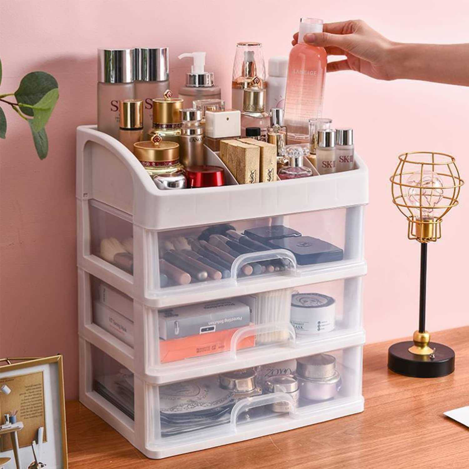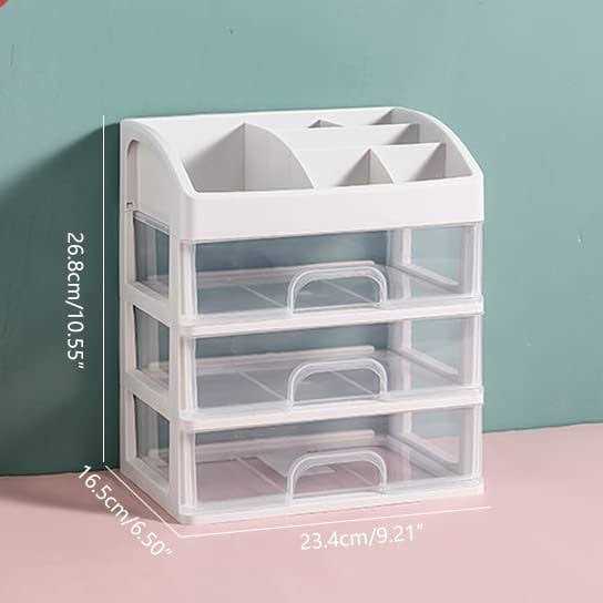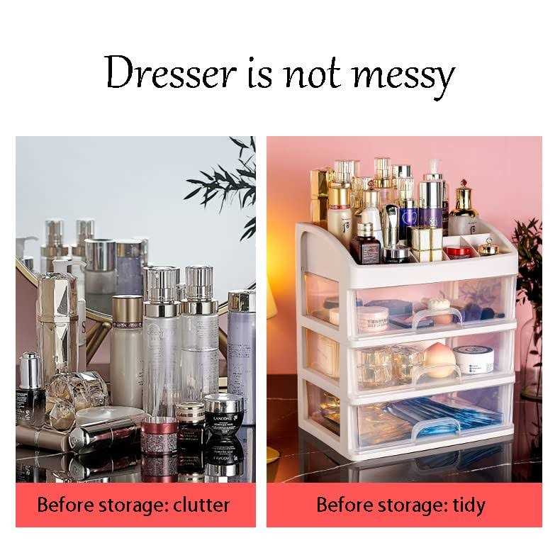 Large Capacity:There has 6 various-sized top compartments and 3 large capacity drawers,the top compartment are very suitable for storing some bottled skin care products and cosmetics such as lotions and toners, 3 drawer could put some other cosmetics like eye shadow, mask, brush and some other small items Material is Sturdy and Easy to Clean: This organizer box made of premium PP with a smooth surface not easy to break,when there is dirt on the surface, just wipe it with a damp paper towel to restore cleanliness Suitable for Many Occasions:You can put it anywhere, bathroom, bedroom, desktop, anywhere as long as you feel the small sundries are messy, you could use this organizer box.In various places, put cluttered small sundries in a storage box like this,isn’t this a very pleasant thing to do? Detail Processing:Each product has been carefully inspected, and the joints are made smooth.The drawer is fixed with a buckle, so that the drawer will not slide into and fall during use,the transparent design also lets you see what’s inside the drawer Good Gift:Ideal gift for Valentine’s Day, Mother’s Day, Thanksgiving Day, Christmas and birthday. You can give it to your lover, child, parents, friends or anyone you want to surprise him.It could make your life beautiful and I’m sure no one would refuse such a gift