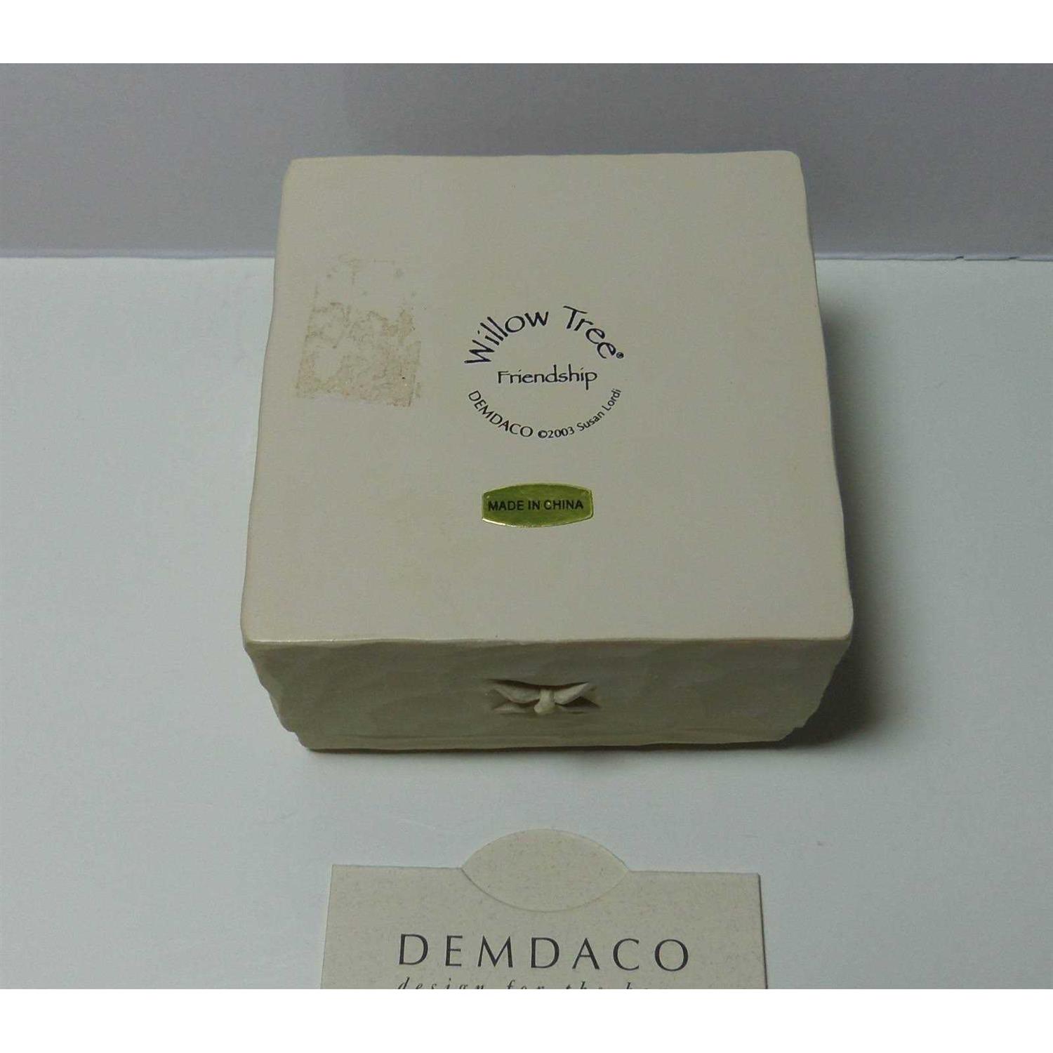 Sentiment written inside box Forever true, forever friends. Includes Enclosure Card The figure on this piece communicates through gesture, to represent an emotion or mark a memory. Willow Tree sculptures express love, closeness, healing, courage, hope emotions of a life well lived 3square x 2h hand painted resin box with bas relief carving on lid. Lid is not attached. Packaged in fitted box ready for gift giving Artist Susan Lordi hand carves the original of each Willow Tree piece from her studio in Kansas City, MO. This piece is cast from Susan s original carving and painted by hand. Since 1999, Susan Lordi has worked in partnership with DEMDACO to produce, market and distribute Willow Tree, her line of carved, figurative sculptures.