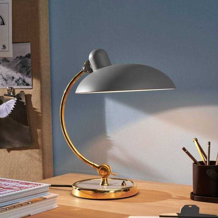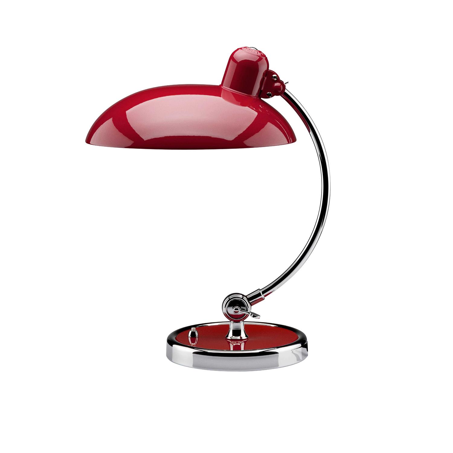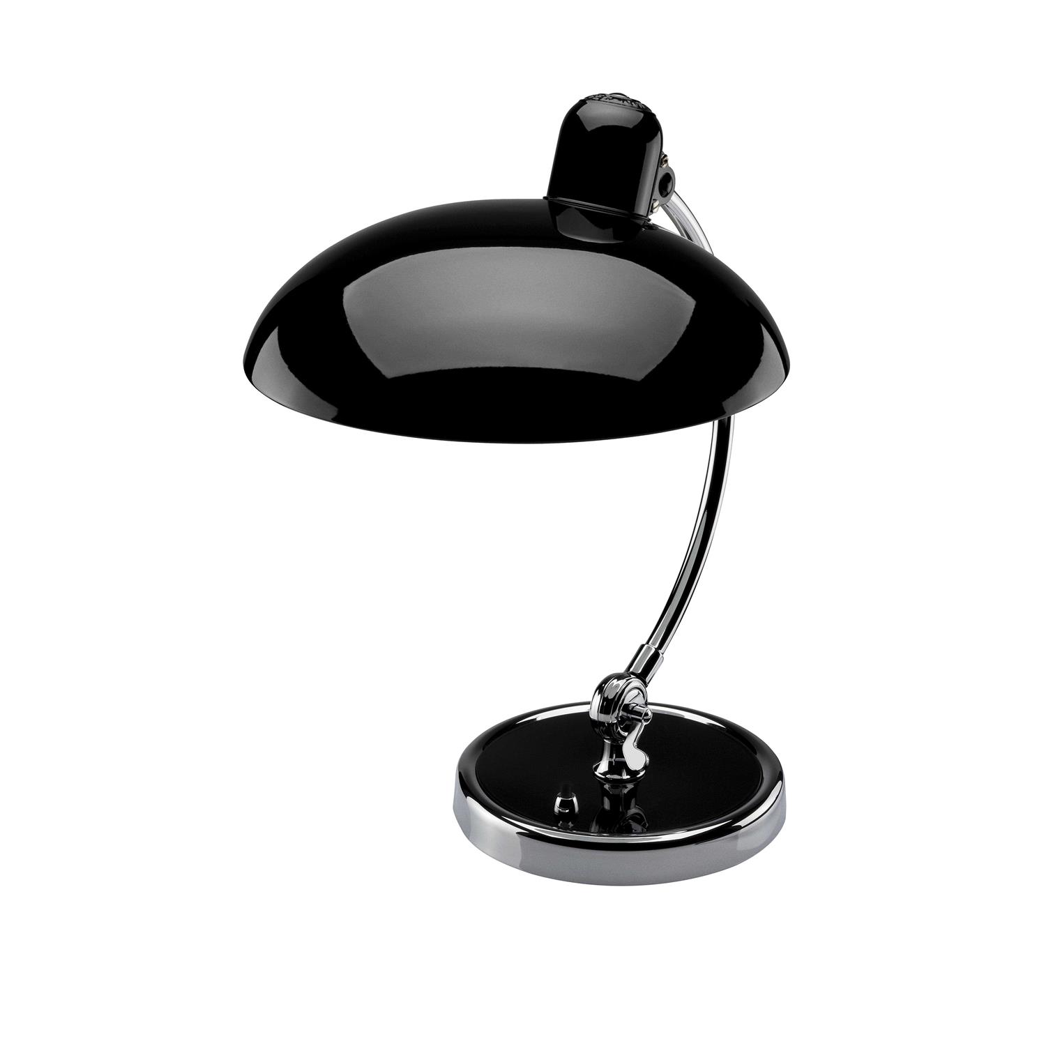 The Kaiser Idell 6631 Luxury Table lamp is equipped with two ball joints. One ball joint ensures that the asymmetrically shaped shade can be swiveled, while the other allows an individual alignment of the arm. An on / off switch is located on the light base.The 6631 Luxury Table lamp was originally designed by Christian Dell in 1931 for the Gebr. Kaiser und Co. Leuchten KG. From the 1960s onwards, this light gained in popularity, as it was placed on the desk of many German television commissioners, which is why it was even called a “commissioner’s lamp”. Like the other Kaiser Idell lights, it also belongs to the Bauhaus style.The lamp is available with a shade in these surfaces: black, matt black, white, green and red. The upper surface of the lamp base is lacquered in the same surface as the shade. In all versions except matt black, the shades are glossy lacquered. The manufacturer Kaiser Idell designates green as “dark green” and red as “ruby red”. The chromium-plated elements of the lamp are polished and made of silver-brazed brass. Each table lamp comes with a certificate of authenticity and an “ORIGINAL KAISER idell” embossing.