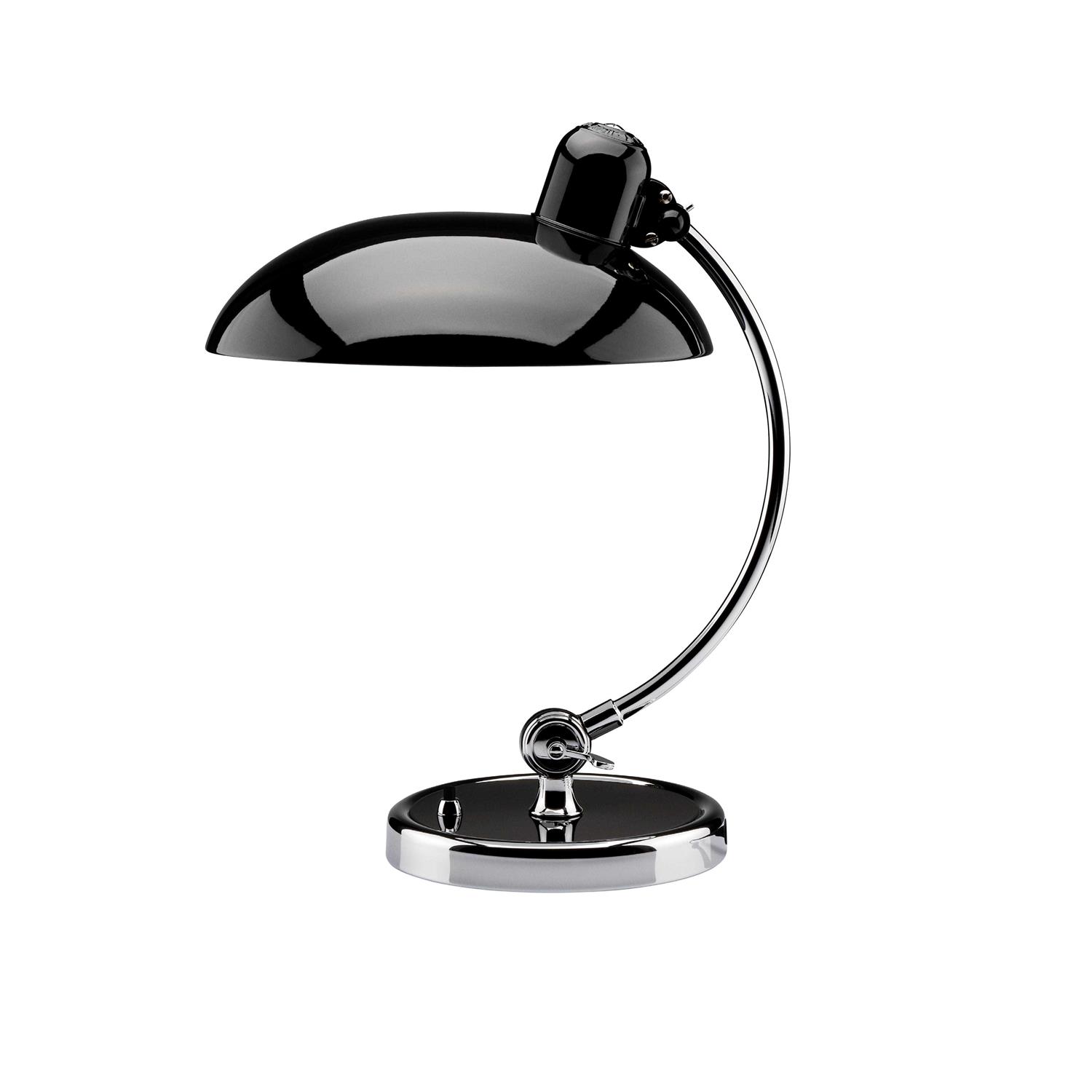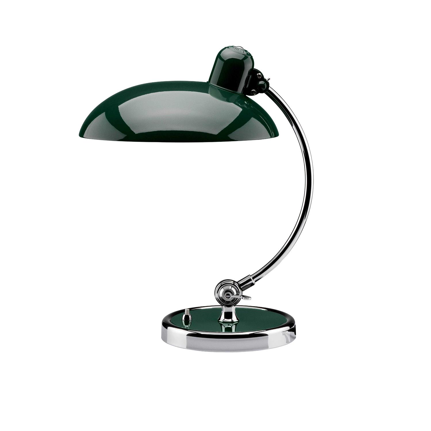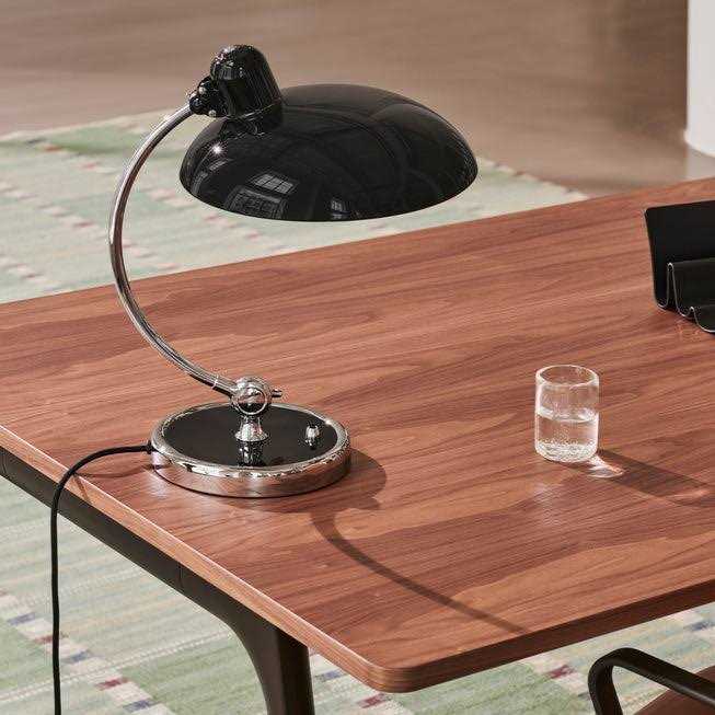 The Kaiser Idell 6631 Luxury Table lamp is equipped with two ball joints. One ball joint ensures that the asymmetrically shaped shade can be swiveled, while the other allows an individual alignment of the arm. An on / off switch is located on the light base.The 6631 Luxury Table lamp was originally designed by Christian Dell in 1931 for the Gebr. Kaiser und Co. Leuchten KG. From the 1960s onwards, this light gained in popularity, as it was placed on the desk of many German television commissioners, which is why it was even called a “commissioner’s lamp”. Like the other Kaiser Idell lights, it also belongs to the Bauhaus style.The lamp is available with a shade in these surfaces: black, matt black, white, green and red. The upper surface of the lamp base is lacquered in the same surface as the shade. In all versions except matt black, the shades are glossy lacquered. The manufacturer Kaiser Idell designates green as “dark green”and red as “ruby red”. The chromium-plated elements of the lamp are polished and made of silver-brazed brass. Each table lamp comes with a certificate of authenticity and an “ORIGINAL KAISER idell”embossing.