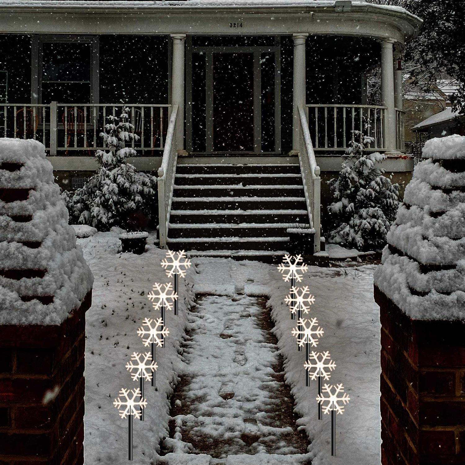 Christmas Pathway Lights-The led landscape light set is inspired by the popular Christmas element snowflakes. This pathway marker is quite suitable for garden decoration during the winter especially during the Christmas season. Decorative led lights for patio, yard, lawn, walkway, driveway and so on. Warm White Light-The led garden light is made of high-transparency material and premium quality led lights. With the warm white light, it will light up your place and help create a charming atmosphere. Timer Function- The snowflakes yard lights has built-in 6 hours timer. It will keep 6 hours on and then 18 hours off everyday. No worry about turning on/off the lights frequently. Battery Operated-This landscape markers are waterproof and the battery case is rain tight as well. So this outdoor Christmas decoration can be used on the rainy or small snowy days. Powered by 3 AA Batteries(Not Include). Outdoor Lighting Dimensions-The length of snowflakes:14.8 in; Wire between sticks: 13.8 in; Leading: 19.7 in. With battery case, it is portable and the unique design allows it to be a great gift choice. With these cute Christmas Garden Lights, you can decorate an illuminated pathway in your garden. This collection is inspired by popular Christmas elements: Snowflakes, Stars and Christmas trees. The holiday landscape lights are made of high transparency material and premium led lights. With classic warm white light, it can be great decorative lighting for patio, yard, lawn, driveway or walkway. The light and the battery case are rain tight so no worry about the rainy and small snowy day outside. 3 AA batteries are required (not included). The built-in 6 hours timer will keep light on for 6 hours and then 18 hours off, repeat everyday. Dimensions: Height of single light: 14.8 in; Wire between sticks: 13.8 in; Leading: 19.7 in. Total length: 6.2 Ft.