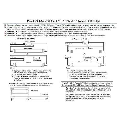 This is a double-end input T8 2FT LED tube light with 10W total input power to replace 18-20W energy-saving fluorescent. It is not dimmable and works from 85-265VAC. The installation is easy, please make sure that the LED Tubes must be directly wired to your 110/120VAC or 220/240VAC house current from the two input ends on both sides without the use of a ballast or starter. ****Please read the manual and description carefully before making any purchasing. **** **** Application notes: LED lights with clear cover are supposed to be used in light fixtures with diffusive cover. They can cause light stripes and non-uniformity if a fixture doesnt have a diffusive cover. Please choose LED lights with milky cover from us if your fixture doesnt have a diffusive cover! ****