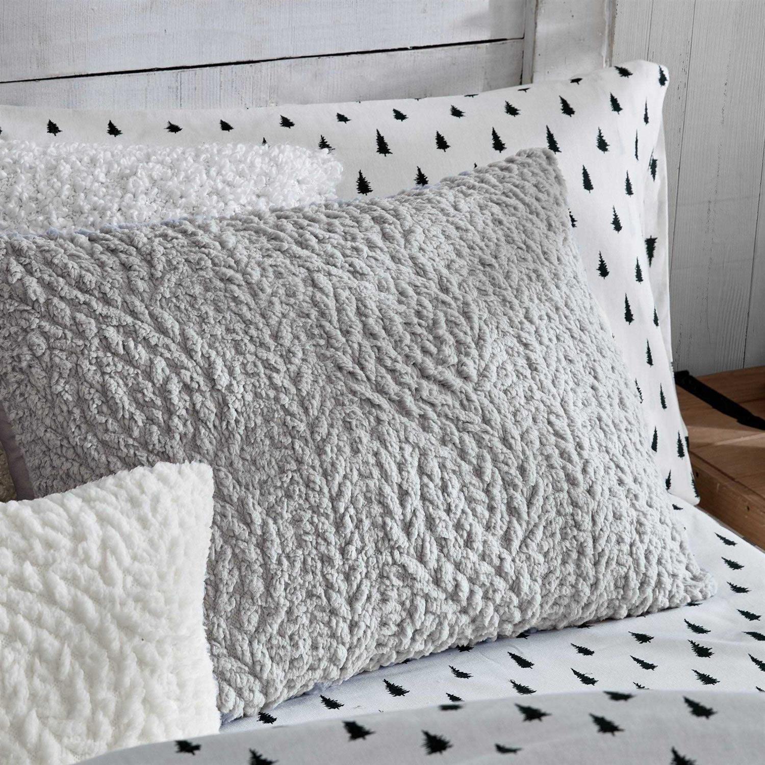 The G.h Bass Cable Knit Pinsonic Sherpa is ideal for warming up by the fire. The Pinsonic is a technique that provides a dimensional texture. When mixed with a cable knit design and ivory Sherpa construction, the result is a textural, cozy wonderland that easily matches any bedding ensemble.