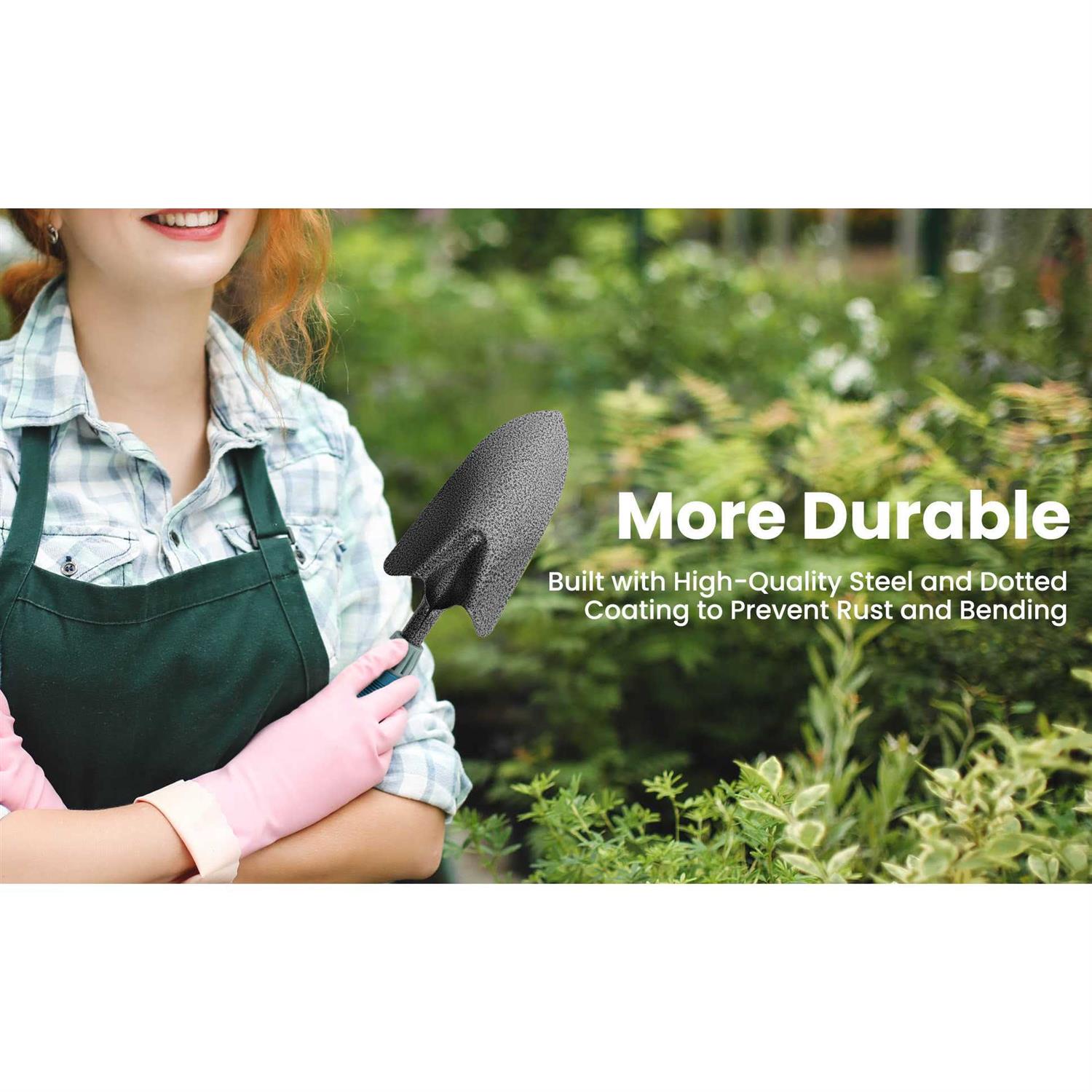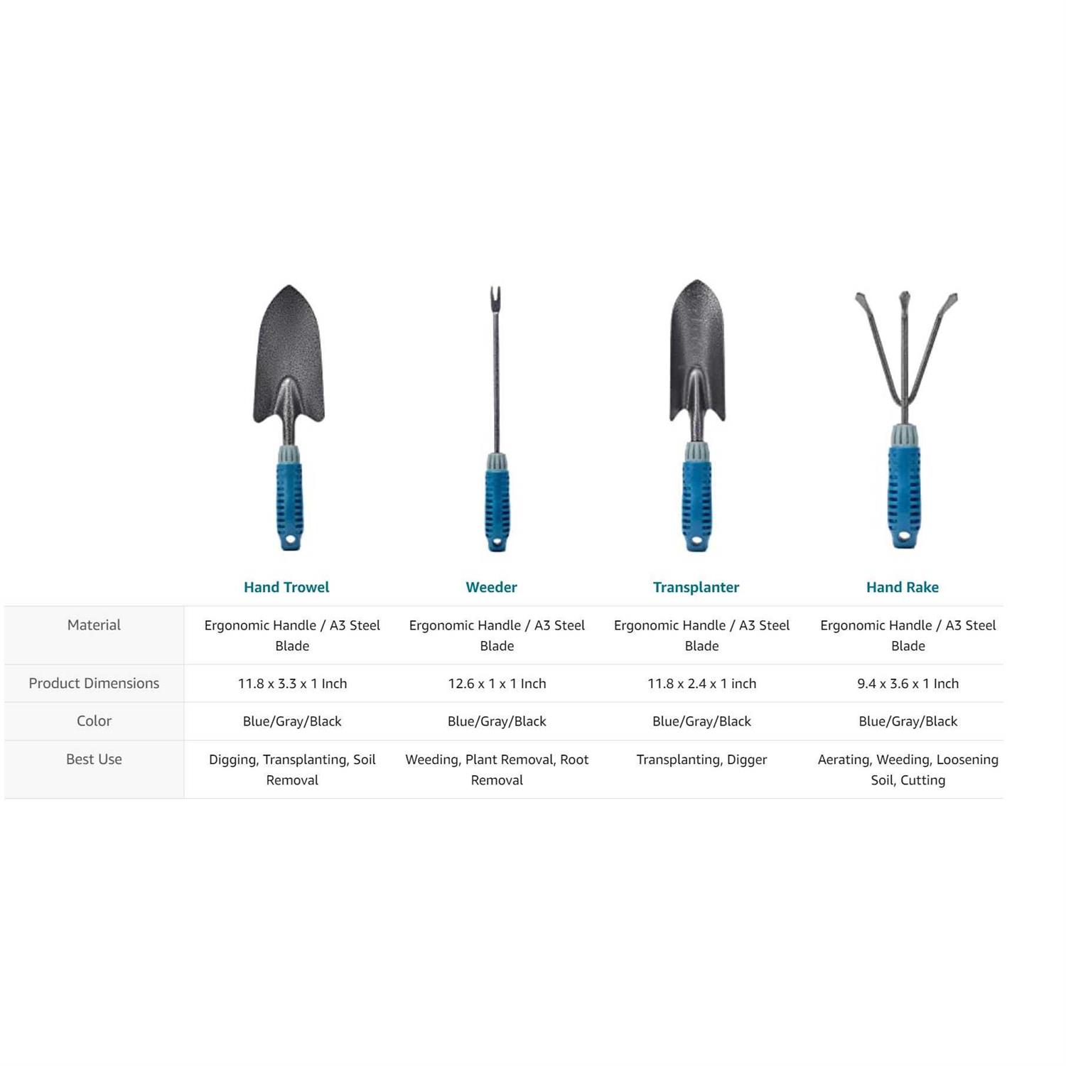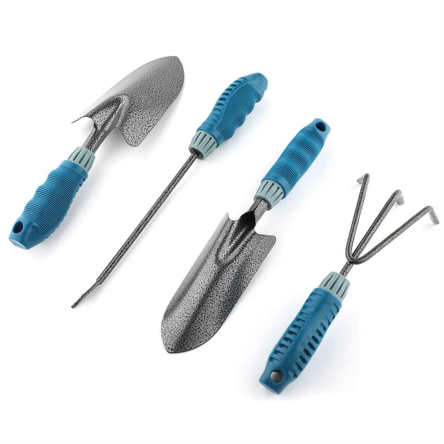 Traditional Garden Tool Set designed for long-term use for both men and women. Included In Set: Trowel Transplanter Hand Rake Weeder Ergonomic and Extra Grip handles reduce pressure and stress on the hands and wrists. The Premium TPR material ensures comfort for extended use and labor-intensive projects/tasks. The superior grip of the handles relieve the pain, strain and fatigue that come with digging, weeding, cutting, transplanting and more. The superior grip of the handles relieve the pain, strain and fatigue that come with digging, weeding, cutting, transplanting and more. The top of the handles come with a hanging hole for clutter-free storage and hanging storage, taking up little space in your shed, workshop, garage, etc. Designed with Heavy-Duty Steel and color coating, the blades/heads are durable, rust-resistant and built to last. The blades are sharp, sturdy, durable and easy to clean, ensuring outdoor projects are more comfortable and less strenuous. Created to withstand harsh and tough surfaces, the blades dig and cut into soil, dirt, mulch, mud and more with force, precision and ease. Ideal for digging, weeding, transplanting, plant removal, soil displacement, planting, aerating, cutting and more, this reliable tool set comes with everything you need. Take on any outdoor or indoor project with this all-inclusive set. The planting set effortlessly transforms gardening/landscaping into a fun, stress-free activity in any environment. The lightweight tools and comfortable handles are perfect for all ages – adults, teens, children, elders and even those with arthritis.