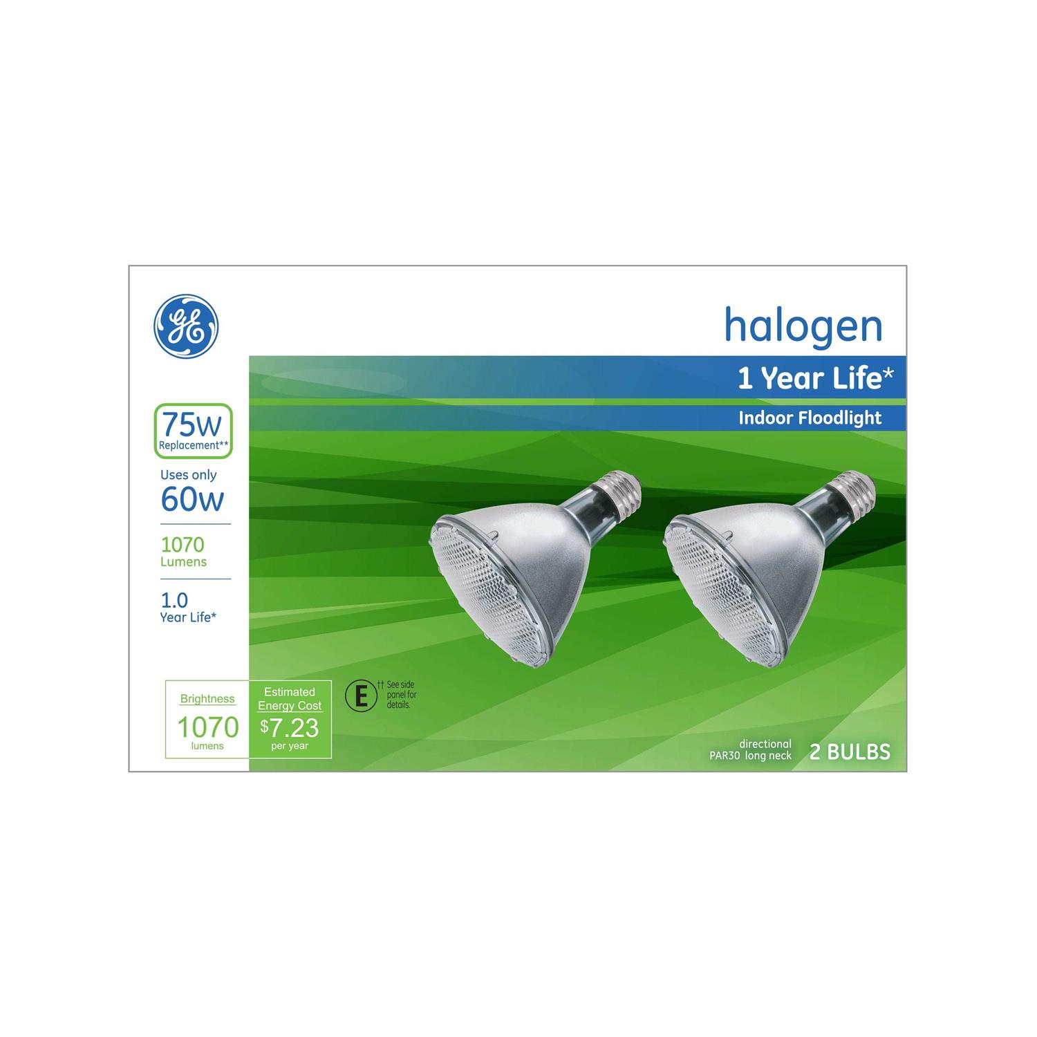 Uses 75 Watts (1070 lumens) Rated to last 1.0 years based on 3 hours per day use GE Halogen 75-Watt Replacement PAR30 Long Neck Indoor Floodlight bulbs cast a wide beam of warm white halogen light. They are dimmable to provide just the right brightness. GE Halogen PAR30 (3-3 with 4-inch diameter) Long Neck Indoor Floodlight bulbs are rated to last 1 year based on 3 hours per day use. Use these halogen PAR30 long-neck bulbs with medium bases in indoor track lighting, can lights, and recessed lighting.
