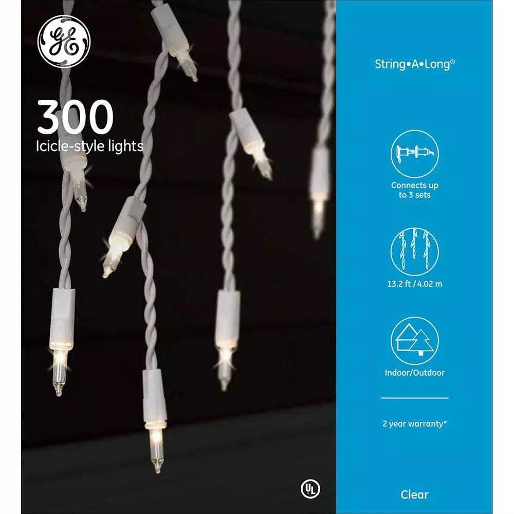 Create holiday magic with the GE String-A-Long 300-Light clear icicle light set. Imagine the brilliant white light of 54 individual icicle strands draped from eaves, rooflines, decks, fences and more. String up to 3 sets end to end for a larger, bolder display on one outlet.