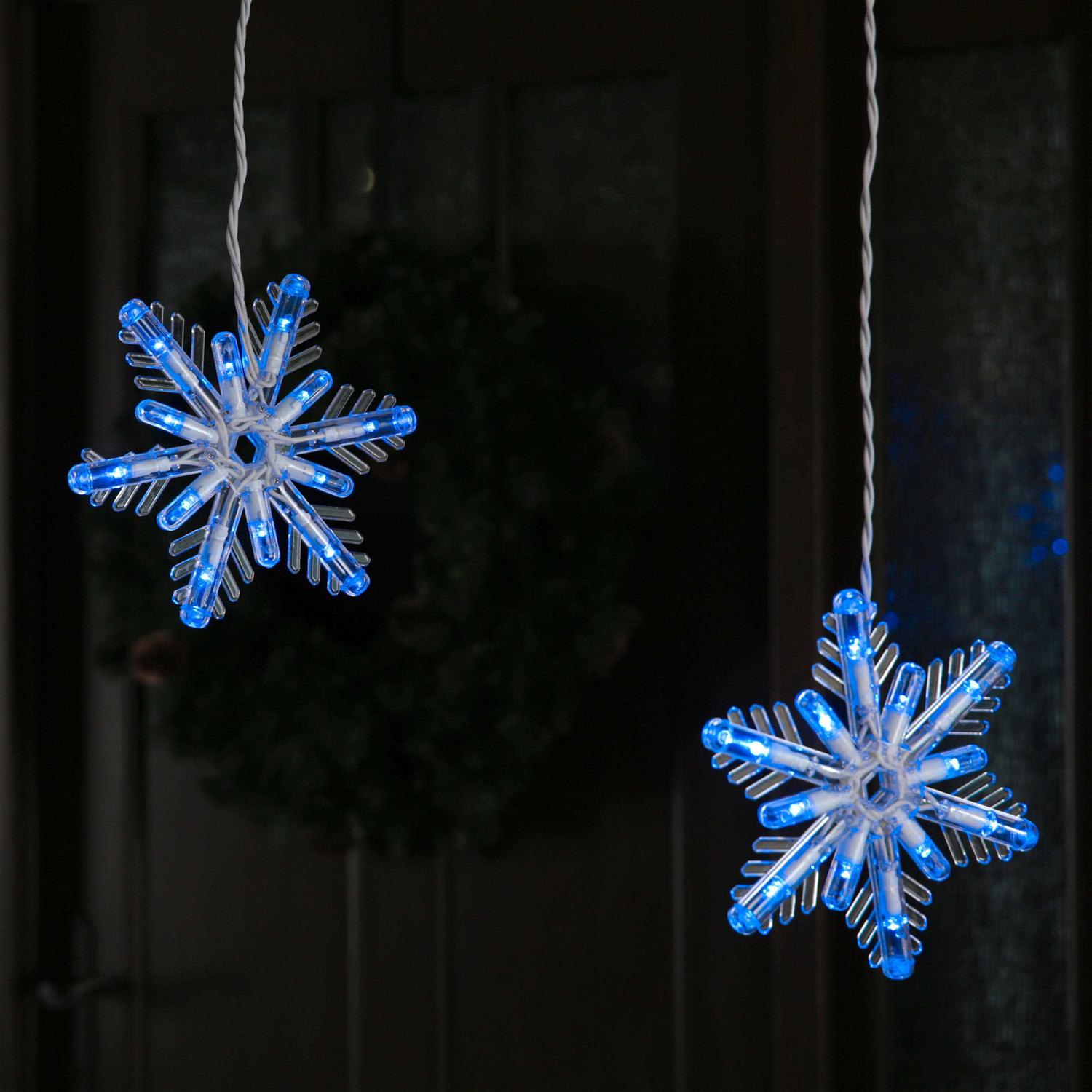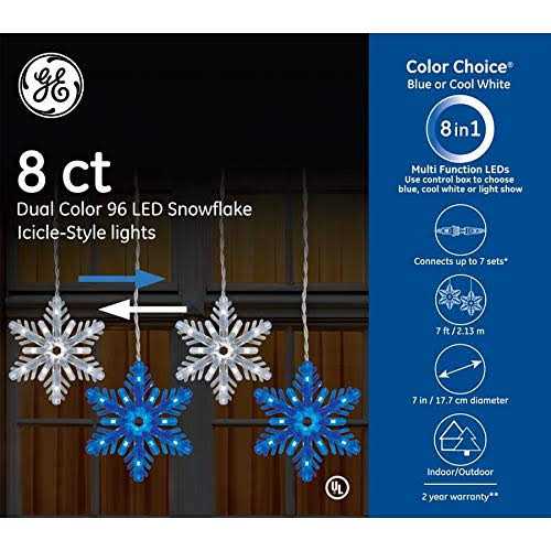 Use the control box to choose between blue, cool white, or light show settings. 7-Inch snowflakes, 12-inch lead wire, 12-inch spacing, 3-inch coaxial end connector plug, 7-feet lighted length, and white cord set.