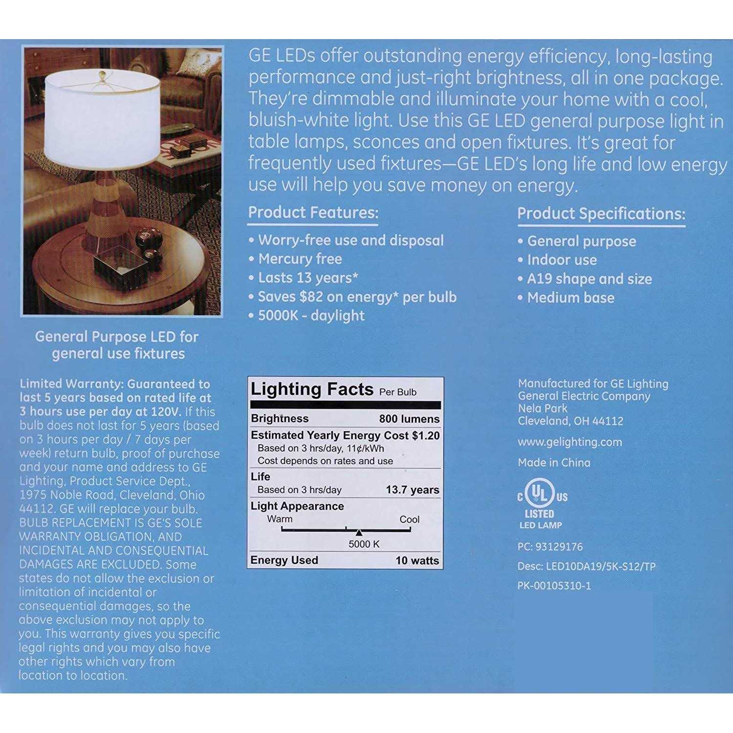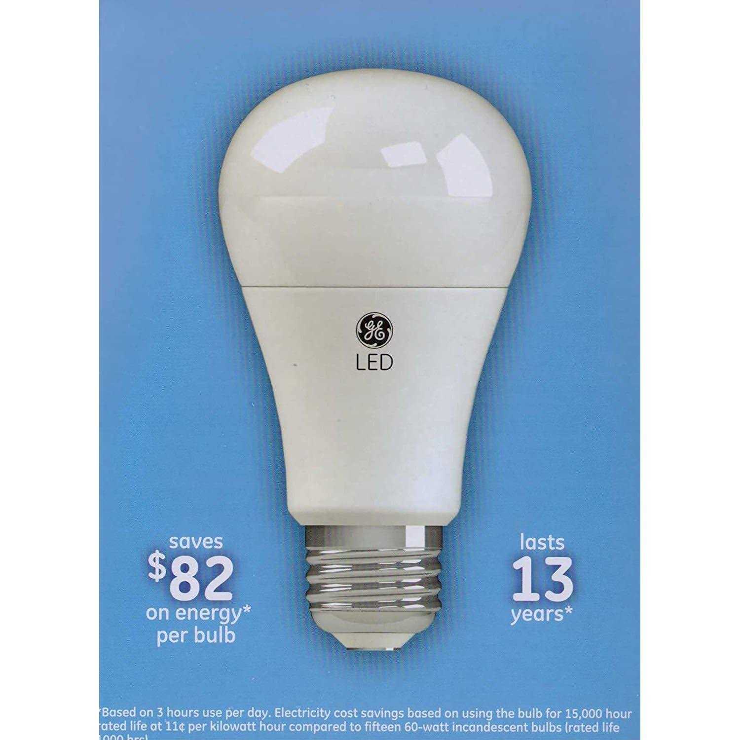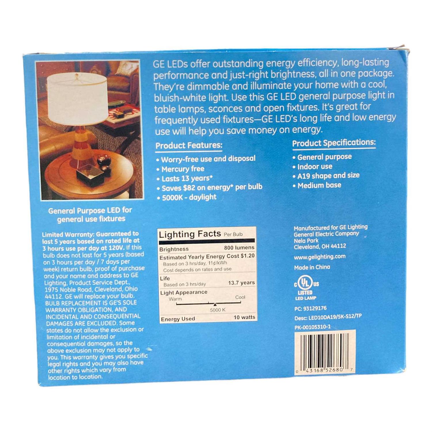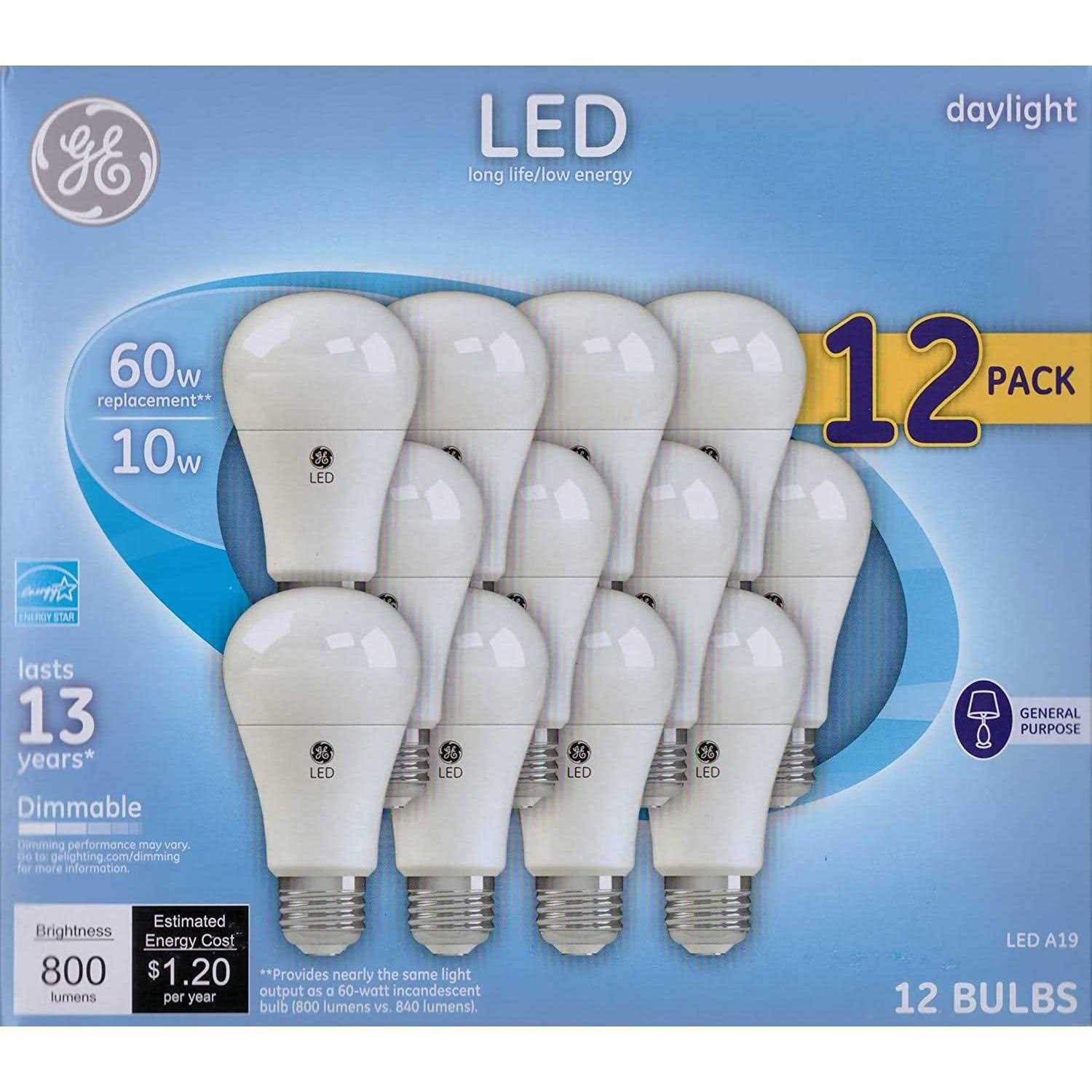 GE Daylight LED 60-Watt Replacement light bulbs offer outstanding energy efficiency, long-lasting performance, and just-right brightness, all in one package. They’re dimmable and illuminate your home with a cool, bluish-white light. These are great for frequently used fixtures—GE Daylight LED bulbs are rated to last 13 years based on 3 hours use per day and cost 1.20 to operate annually. Unlike CFL bulbs, GE LED bulbs feature instant full brightness and are free of Mercury. Replace CFL and incandescent light bulbs with GE Daylight LED general-purpose light bulbs in indoor table lamps, sconces, and open fixtures, including damp locations.