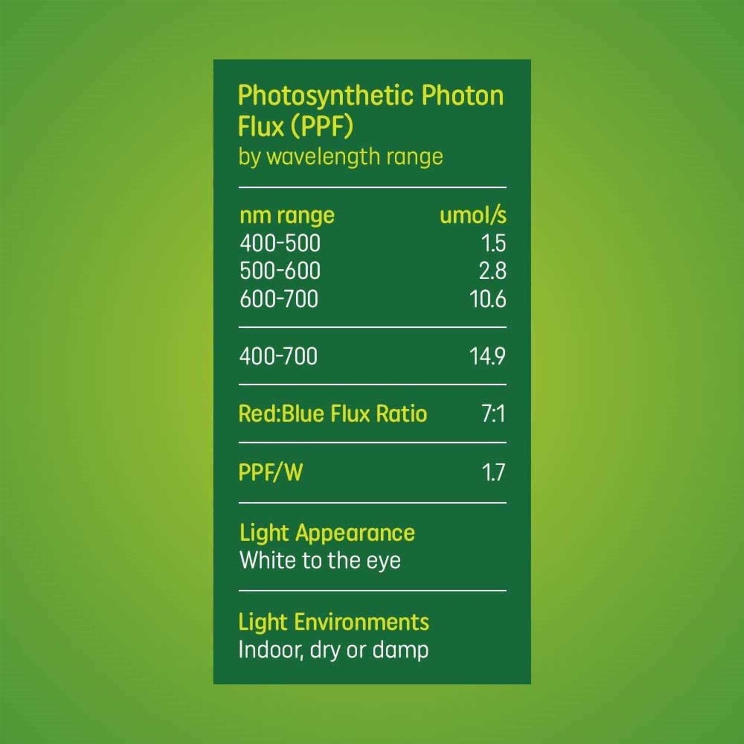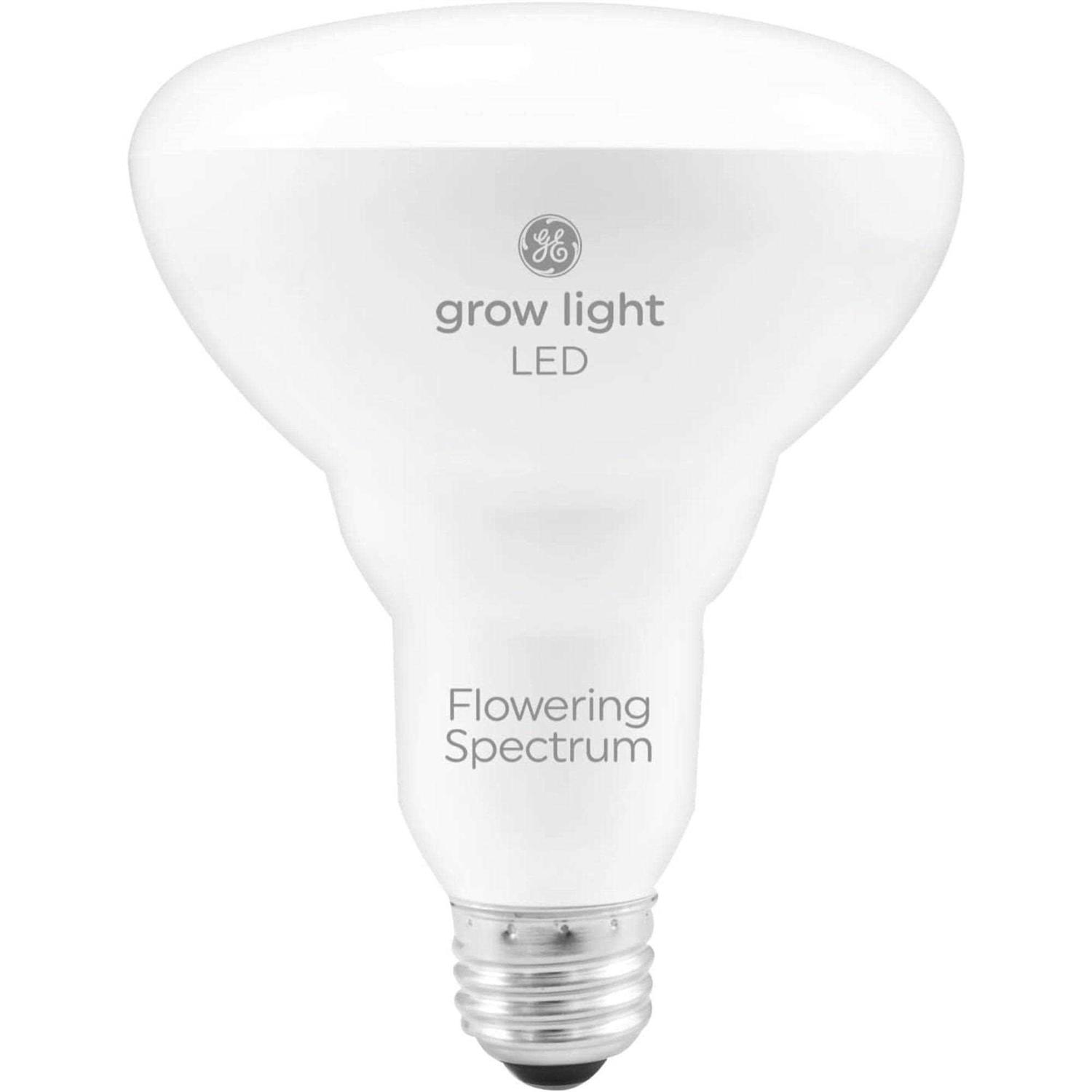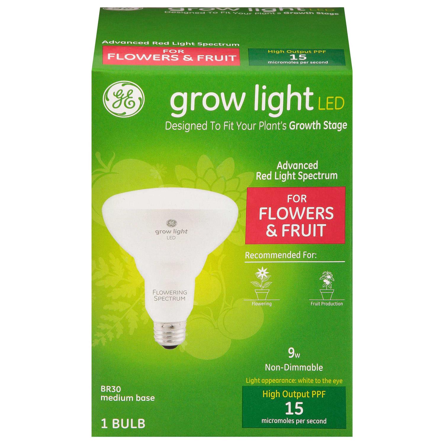 Growing Light Bulbs by GE Lighting. Details:Grow Light LED with advanced red light spectrum for flowers and fruit is designed to fit your plant’s growth stage. Grow Light uses an advanced red light spectrum that allows plant pigments to optimize their light harvesting and inspired by best practices used by professional growers. It’s designed for mature plants at the fruiting or flowering growth stage. Compared to typical purple grow lights, the light features high PPF, or photosynthetic photon flux, to provide more light for photosynthesis and growth. The white light appears more natural to the human eye, so you can appreciate your plant’s beauty and spot pests or discolorations to help keep your plants healthy. Use the advanced red light spectrum with high light plants like tomatoes, cucumbers and peppers at the fruiting or flowering stage of growth.