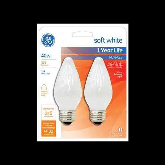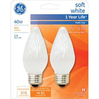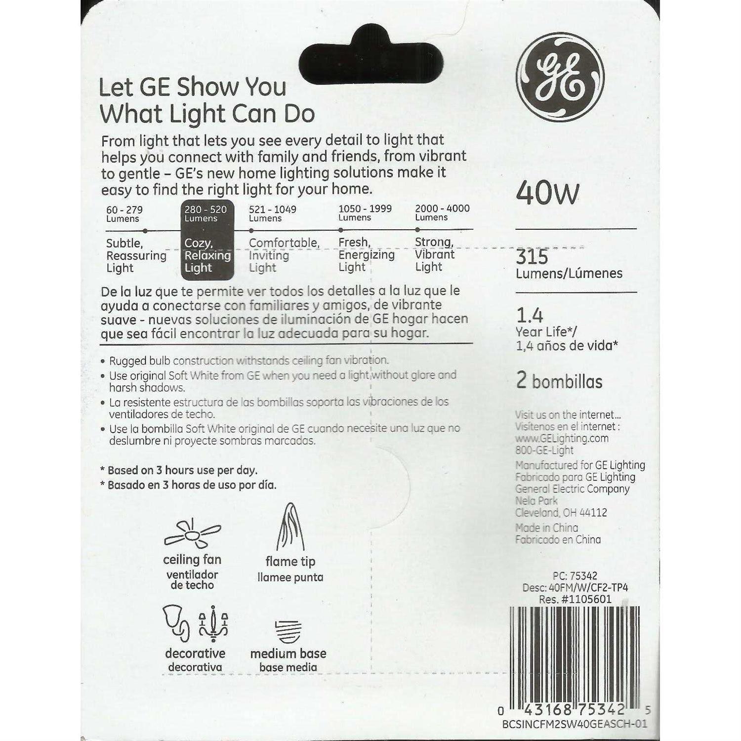 Great for use in vanity strips Estimated yearly energy cost $4.82 based on 3 hours per day $0.11 per wKh Lasts 1.4 years based on 3 hours per day usage Flame tip globe with medium base 2500 K 315 lumens providing subtle, reassuring heat Uses 40 watts 2 Count GE’s best incandescent soft white line has the same size, shape and dimmability with nearly the same brightness as traditional incandescents, but with one big change: it now pays you back using 28% less energy. GE energy-efficient soft white bulbs provide warm, pleasing everyday light without harsh glares or shadows. GE energy-efficient soft white ceiling fan bulbs feature a rugged filament that resists fan vibration better than a standard incandescent bulb, making these bulbs the ideal choice for ceiling fans.