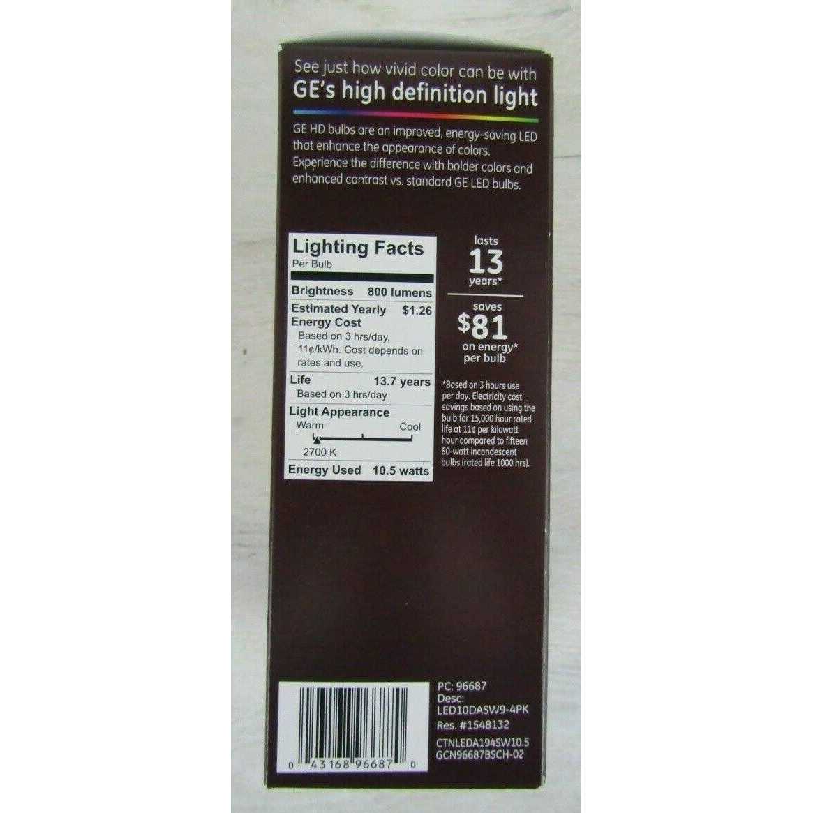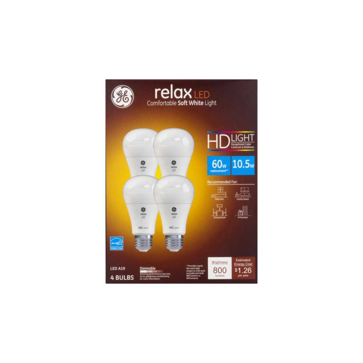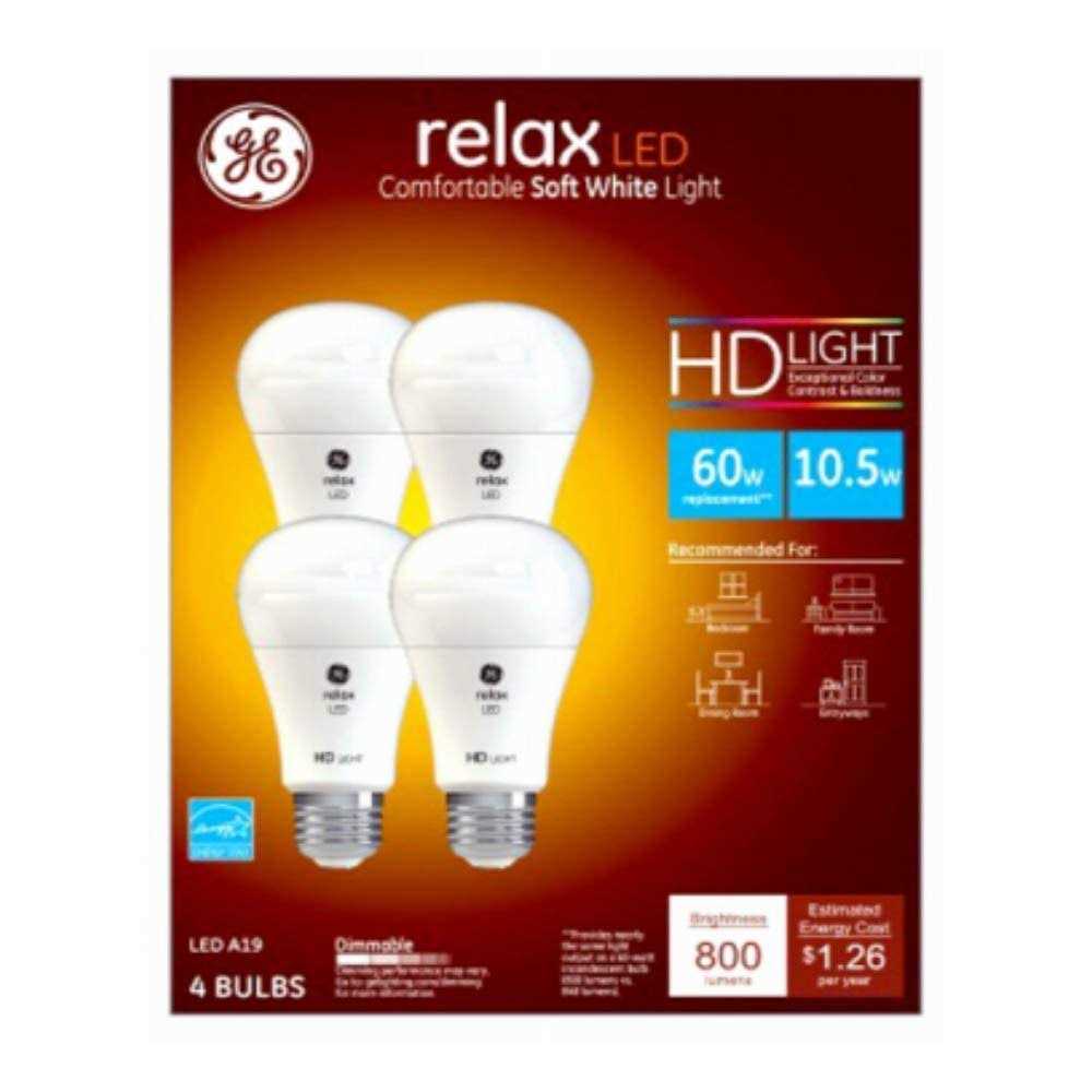 GE s HD relax Soft White LED 60-Watt Replacement A19 General Purpose bulb offers outstanding energy efficiency, long-lasting performance and exceptional color contract & boldness, all in one package. It offers a warm, soft light perfect for comfortable moments and cozy spaces. Use relax light in spaces like bedrooms, family rooms and dining rooms. Rated to last 13 years based on 3 hours use per day, GE s LED saves $81 in energy costs over the rated life of the bulb at $0.11 kW/h compared to an 60-Watt incandescent A19. Use GE s HD relax Soft White LED 60-Watt Replacement A19 General Purpose bulb in dimmable table and floor lamps and may other lamp fixtures in the home. FeaturesGE s HD relax Soft White LED 60-Watt Replacement A19 General Purpose bulb offers outstanding energy efficiency, long-lasting performance and exceptional color contract & boldness, all in one package. It offers a warm, soft light perfect for comfortable moments and cozy spaces. Use relax light in spaces like bedrooms, family rooms and dining rooms. Rated to last 13 years based on 3 hours use per day, GE s LED saves $81 in energy costs over the rated life of the bulb at $0.11 kW/h compared to an 60-Watt incandescent A19. Use GE s HD relax Soft White LED 60-Watt Replacement A19 General Purpose bulb in dimmable table and floor lamps and may other lamp fixtures in the home.
