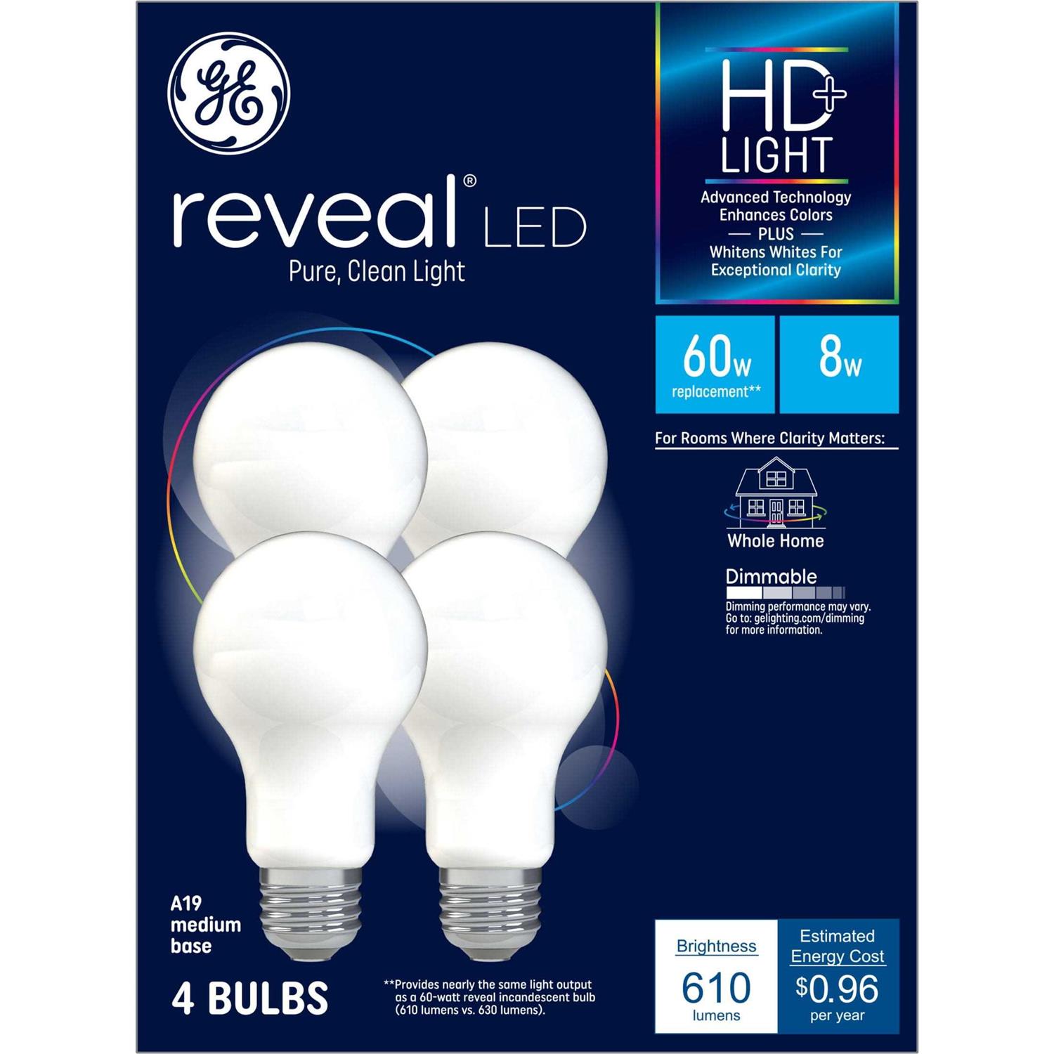 GE Reveal HD+ LED light bulbs provide pure, clean light. The advanced technology enhances colors plus whitens white for exceptional clarity. Replace ordinary bulbs with Reveal light to see vivid colors and vibrant whites in high definition. They’re dimmable and illuminate your home with clean, beautiful light. These are great for frequently used fixtures-GE Reveal HD+ LED bulbs are rated to last twice as long as GE Basic LED bulbs and save 85 dollars on energy costs over the bulb’s life versus a 60-Watt Reveal incandescent bulb.