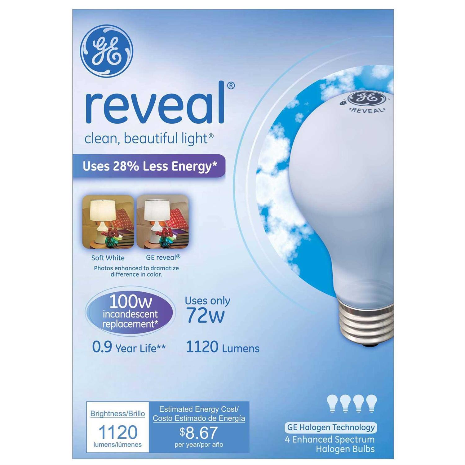 Reveal halogen bulbs filter soft white’s dull yellow rays enhancing colors and whitens white for exceptional clarity. Replace ordinary bulbs with reveal light to see vivid colors and vibrant whites in high definition. They’re dimmable and illuminate your home with clean, beautiful light. Use them where clarity matters, especially kitchens, bathrooms and craft and hobby spaces.