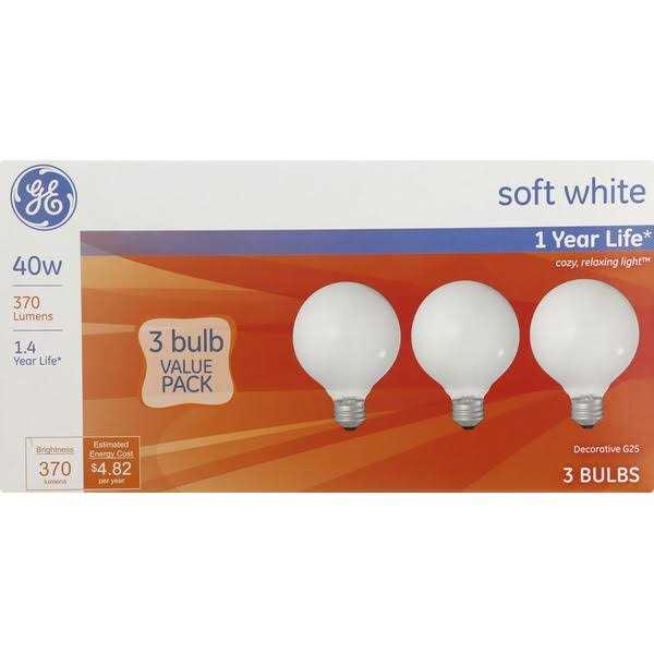 The GE Incandescent Light Bulb is a reliable and energy-efficient lighting solution. With a wattage of 40 and a brightness of 370 lumens, this bulb provides a warm and inviting light. The color temperature of 2800 K creates a cozy and comfortable atmosphere. The globe G25 shape and E26 base make it easy to install in various fixtures. This pack includes 3 bulbs, each with a lifespan of 1,500 hours, ensuring long-lasting illumination.