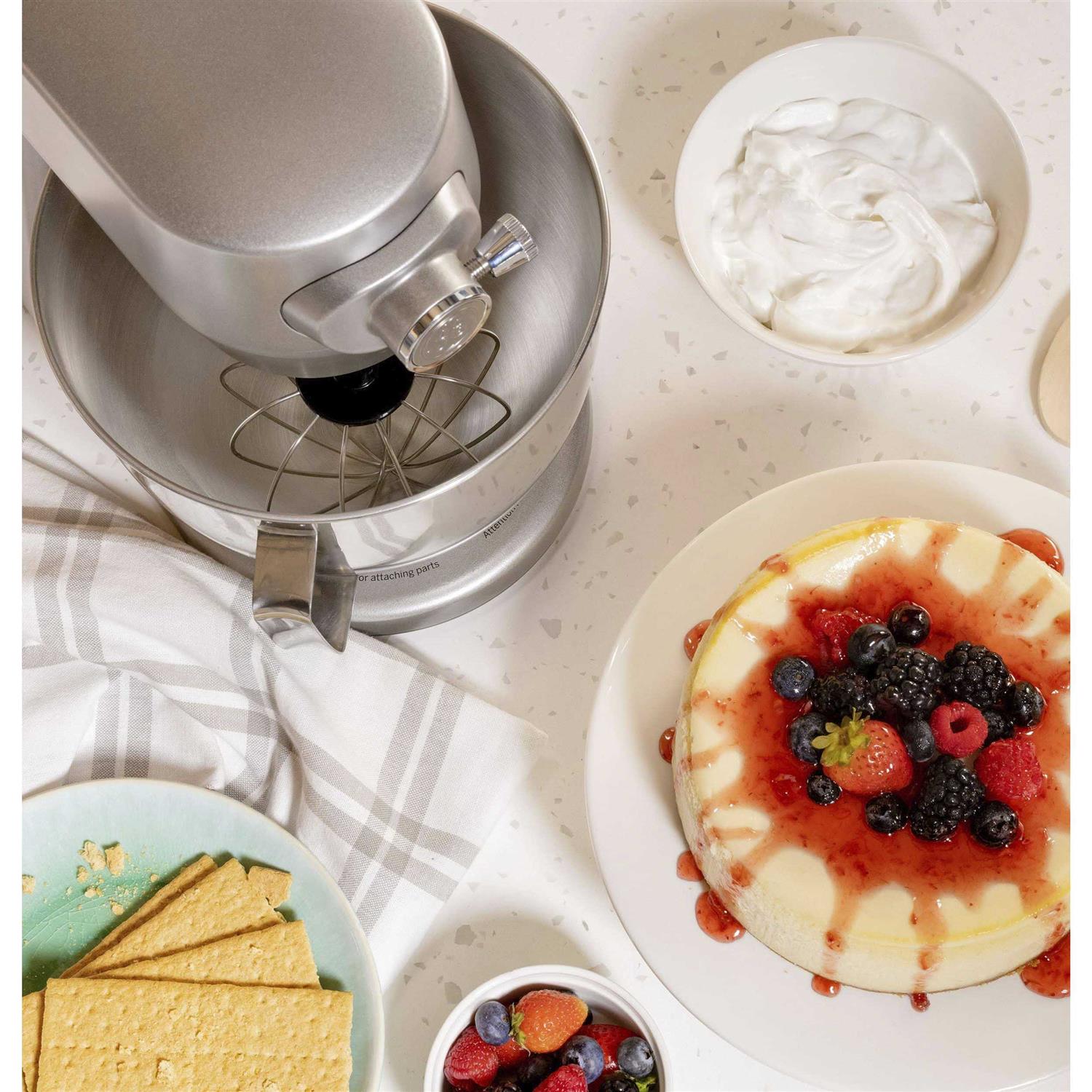 The GE 5.3 Quart Tilt-Head Bowl Lift 7-Speed Stand Mixer is a timeless kitchen essential, perfect for everyday baking needs. With an Easy Lift tilt-head, 5.3 qt. capacity, and a powerful 350-watt motor, this mixer can tackle your toughest tasks, big and small. Enjoy clear visibility and easy access to the mixing bowl thanks to a tilt-back head, which automatically secures upon closure for added peace of mind. Handle even your toughest baking challenges with a motor that’s powerful enough to knead the dough, whip stiff peaks, and anything in between. The mixing cycle is engineered to provide superior bowl coverage and combine ingredients thoroughly. This mixer offers powerful performance in a compact size for easy storage and transport. The mixer design is stylish and versatile, plus it reduces machine crud cracks, making cleanup a breeze. Enjoy strength and stability that lasts thanks to a durable die-cast construction. Turn your mixer into a kitchen multi-tool with 7-optimized speeds for essential mixing and an accessory port that is compatible with third-party attachment ecosystems. Tackle even your greatest holiday tasks with a sturdy 5.3 qt. stainless steel bowl that holds up to 9 batches of cookie dough at once. No need to worry about flour messes and batter splatter thanks to a soft start motor that eases the mixer into powerful performance, no matter which speed you choose.
