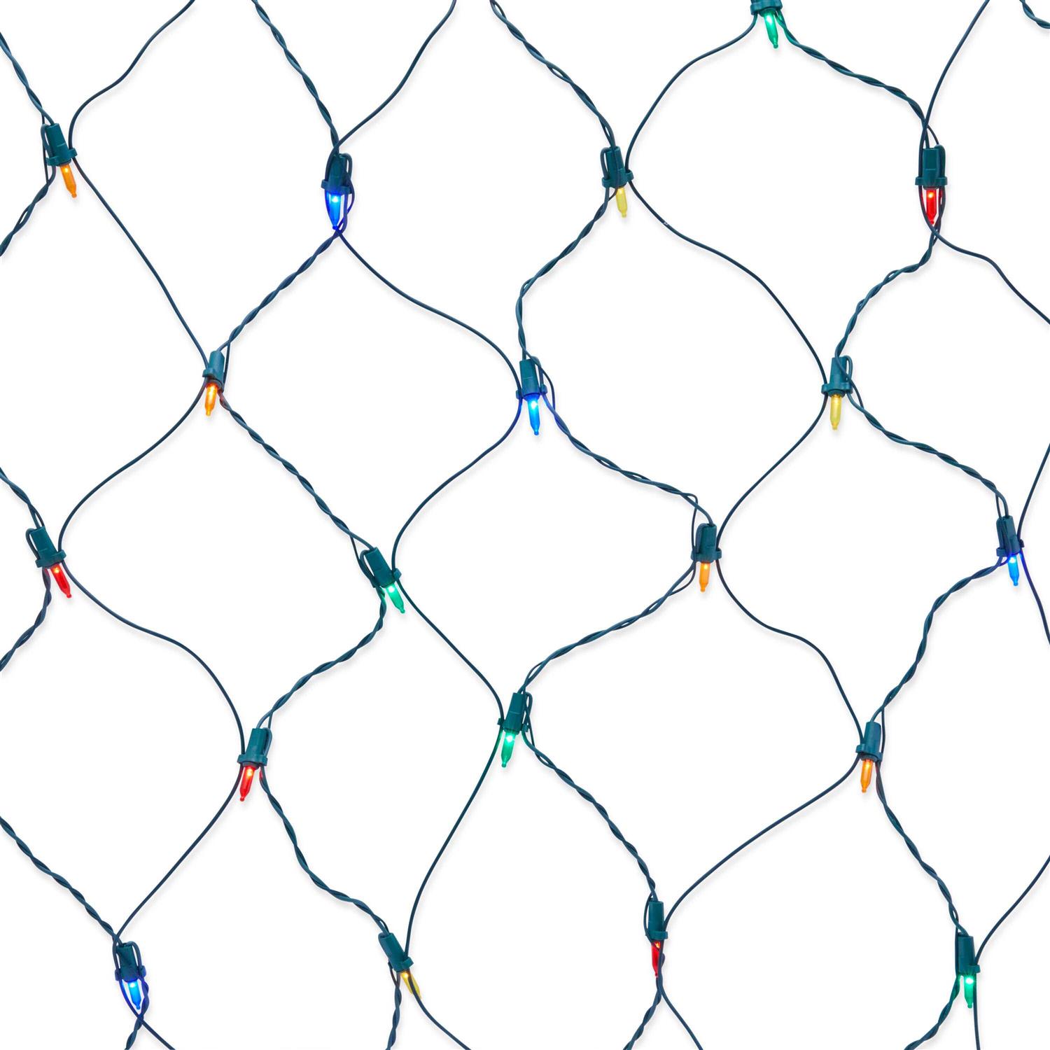 GE StayBright LED 5.5mm traditional miniature 150-count multicolor net light set. 24-inch lead wire, 3-inch end connector plug, 6-feet x 4-feet (24 Sq. Ft.) lighted area, and green cord set with fused plug.