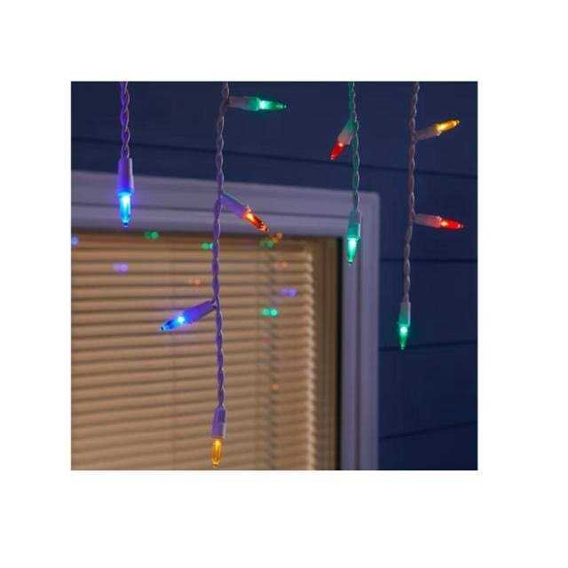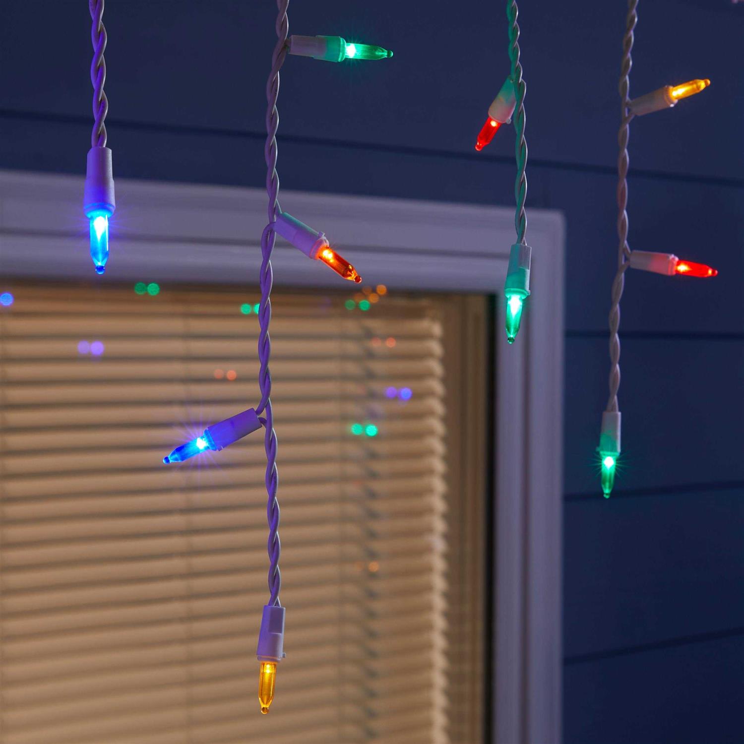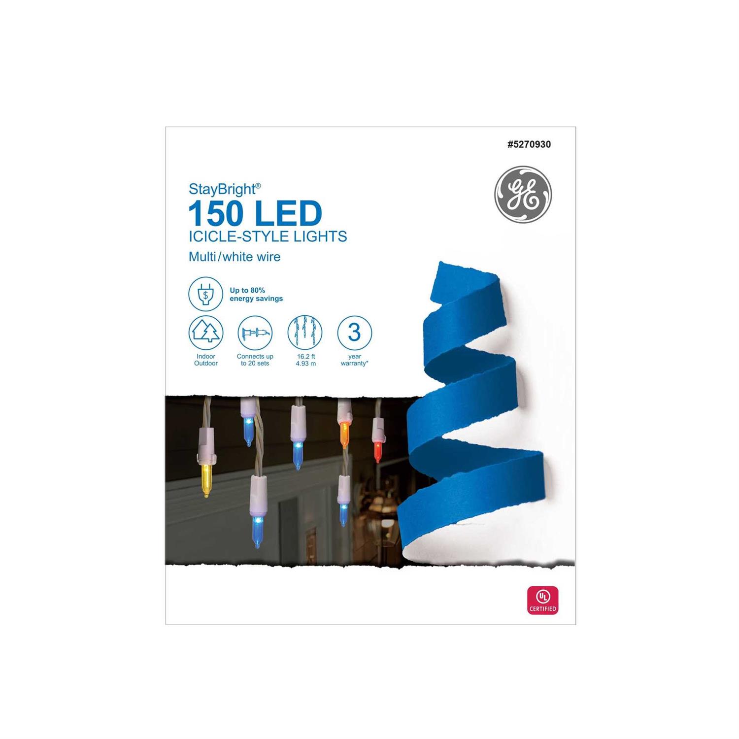 GE StayBright LED 5.5mm traditional miniature 100-count multicolor icicle light set. 3-Inch lead wire, 3-inch bulb spacing, 5-inch strand spacing, 3-inch end connector plug, 16.25-feet lighted length, and white cord set with fused plug.