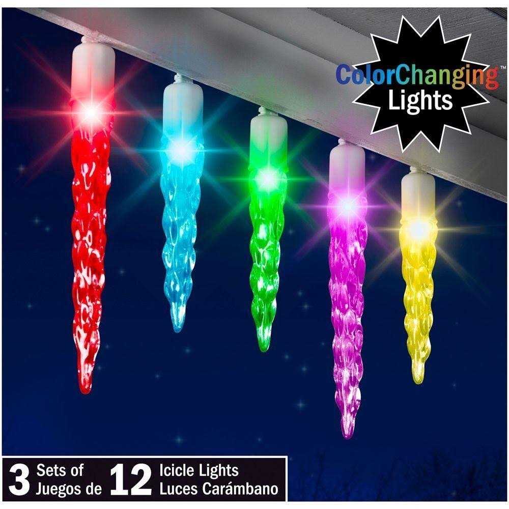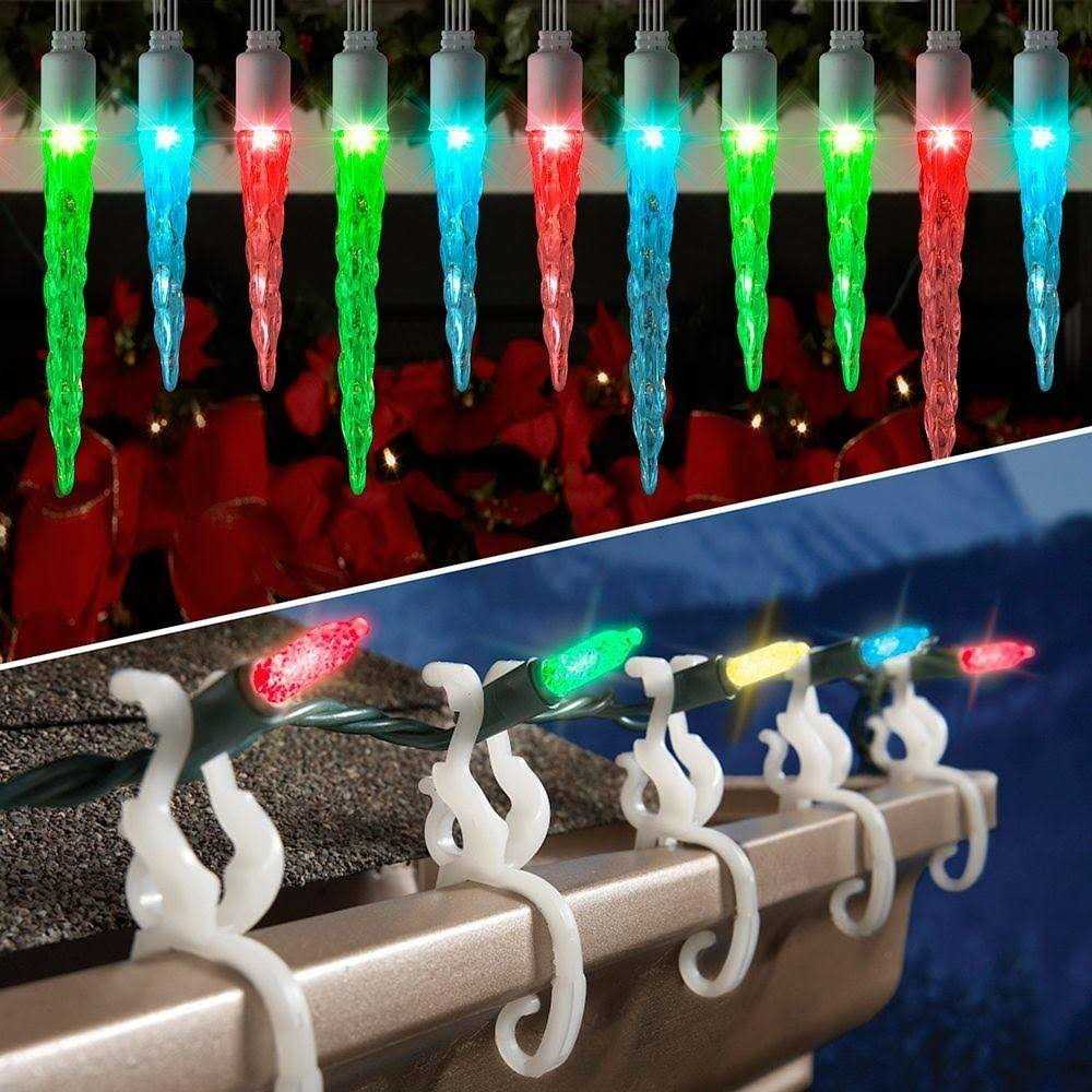 Kit includes: 3 light strings of Color Changing Light Show String-S/12-Icicle, 2 strings of Starry Night Light String-50 count Multi-color and 36 count Universal Shingle/Gutter Clips. Features energy-efficient LED lights Mounting hardware included 3 sets of 12-count alternating multi-color LED 7 in. and 5 in. icicles 11 ft. lighted length 12.5 ft. total length for a total of 33 ft. lighted length 37.5 ft. total length create a synchronized show of color changing lights. 2 sets of 50-count multi-color LED -14 ft. lighted length each 15 ft. total for a total of 28 ft. lighted length 30 ft. total length that creates random points of flickering light. 36 all-purposed light clips for use on shingles or gutters. Rated for 20,000 hours of bulb life. Connects end-to-end up to 3 kits. For indoor or outdoor use. Entire kit has a total of 61 ft. of lighted length.