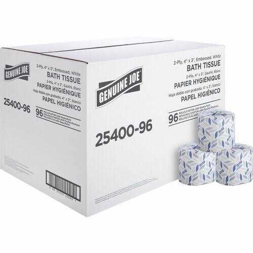 Genuine Joe Standard Bath Tissue RollsEmbossed bath tissue offers two-ply sheets that are securely overall-wrapped for maximum sanitation. Perforated tissue offers exceptional whiteness, absorbency and softness and is suited for restroom applications. Each Genuine Joe toilet paper roll fits standard-roll, bathroom-tissue dispensers.