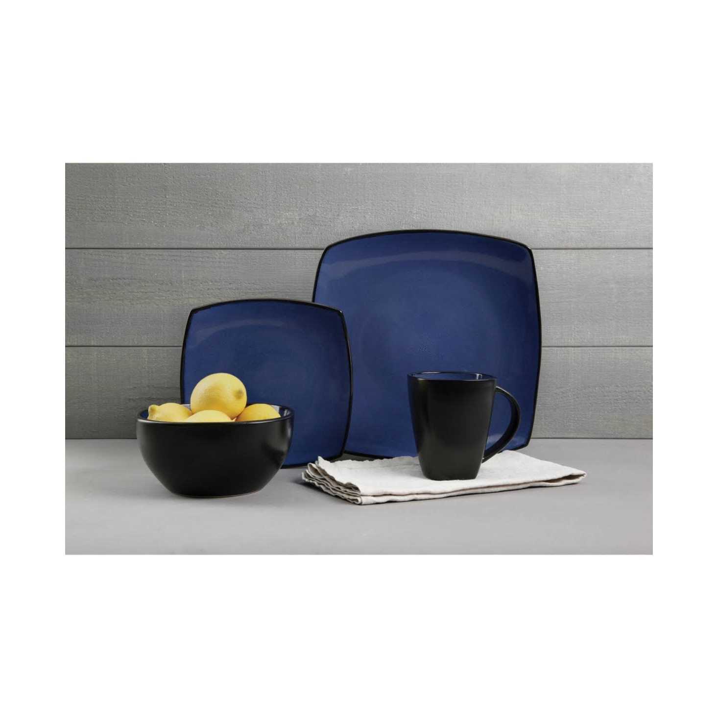 It is made of highly durable ingrained glossy design stoneware that is built to last for years. It is perfect for everyday use and for any special occasions. The vibrant colors are a perfect addition to any table set. This set includes: four 12.75″ square dinner plates, four 9″ square dessert plates, four 6.25″ bowls, four 13 oz two-tone reactive glaze mugs. Color: Blue.