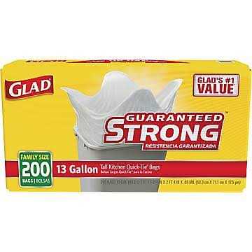 Glad ̈ Quick-Tie ̈ Trash Bags are designed with strong and dependable Quick-Tie ̈ flaps to keep the bag securely shut. The trash bags are built with 3 ply strength to support easy lifting and transporting the fullest load. With Glad ̈ Quick-Tie ̈ bags, you can securely and conveniently close the bag by cross tying the flaps. The 13 gallon size is perfect for kitchens, break rooms or throughout the workplace. Avoid messy trash disasters with these sturdy Quick-Tie ̈ flaps from Glad ̈.