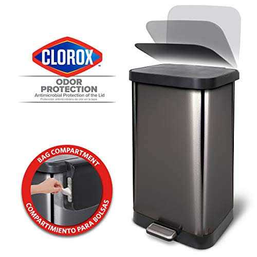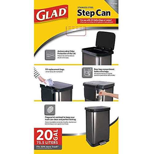 Stainless Steel Step Can with Antimicrobial Lid in Pewter has Clorox TM Odor Protection that offers antimicrobial protection of the lid and lid frame by inhibiting growth of Odor causing bacteria for the life of the can. It was manufactured with a rear bag compartment that allows for time saving and easy extra bag storage and the large capacity design holds 50% more trash than the 13 Gal. trash can. Bag Rings allow for keeping the trash bag secure, in place, and out of sight. The design of the complete lid and frame hinge allow for easy disposal of bulky trash bags and provides convenient and quiet step operation with a controlled gentle closure. The stainless Steel design is fingerprint resistant which provides for a clean and polished look.