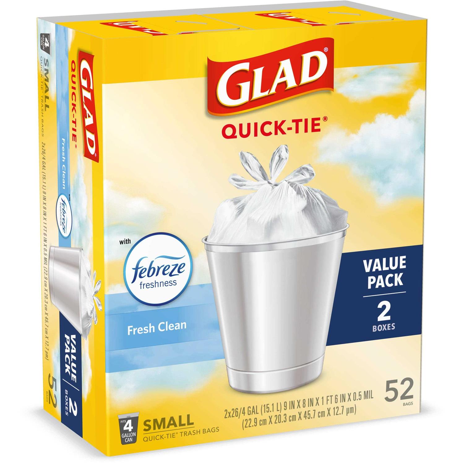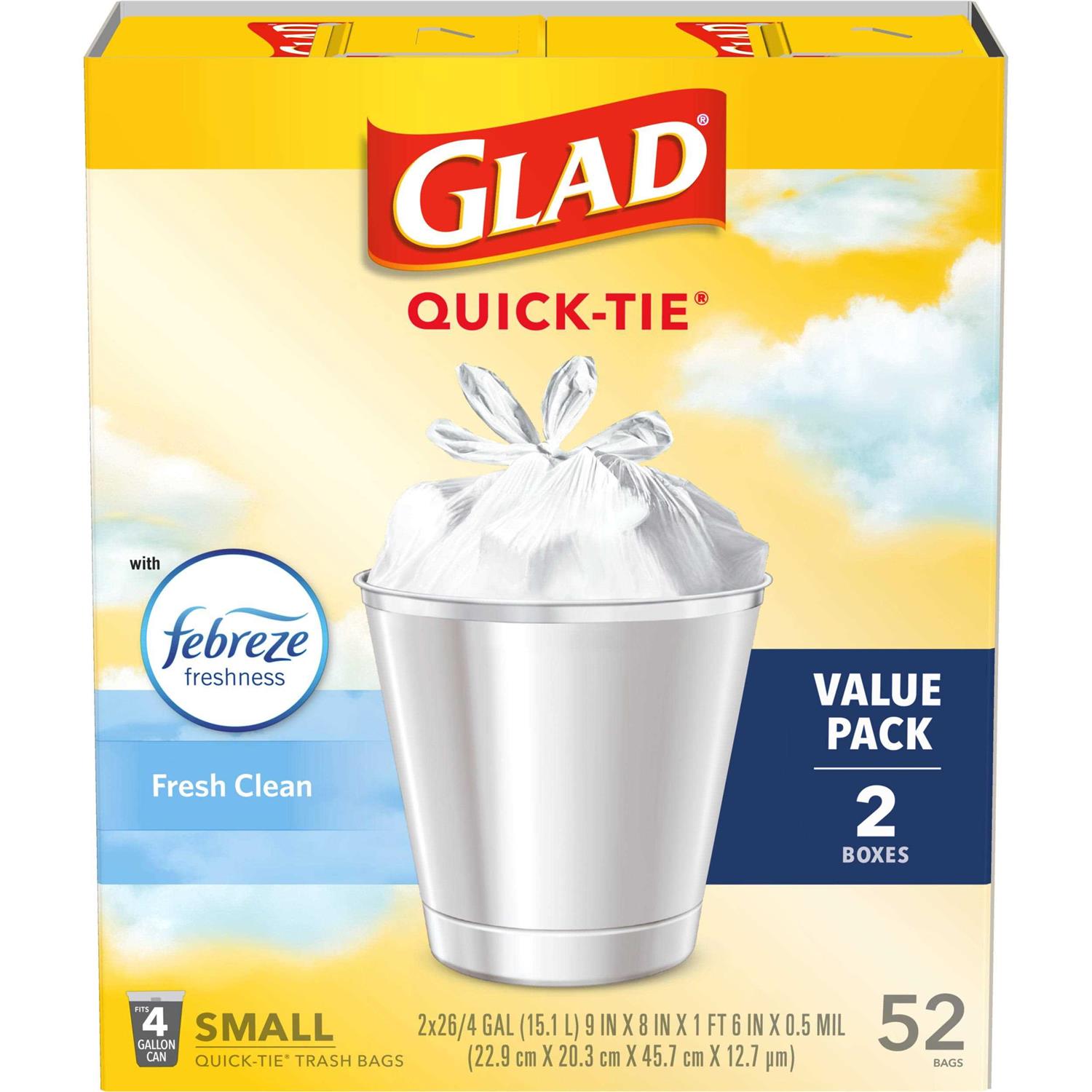 Glad OdorShield Small Trash Bags with Febreze provide strength plus odor control, to keep homes and workplaces smelling fresh and clean. These small garbage bags are made with OdorShield technology and Febreze freshness to provide continuous odor neutralization, based on time lapse technical evaluation, for long lasting freshness around the house. They are also strong and sturdy to avoid messy trash disasters as you transport it. These 4 gallon size trash bags, in Fresh Clean scent, fit small size trash cans and are great for use in restroom, kitchen, desk and break room bins. Ideal for schools, offices and daycare centers. Usage Directions: Line small trash can with trash bag. Dispose of bag when full. Caution Statements: Plastic bags can be dangerous. To avoid danger of suffocation, keep all plastic bags away from babies and children. DO NOT USE in cribs, beds, carriages or playpens.