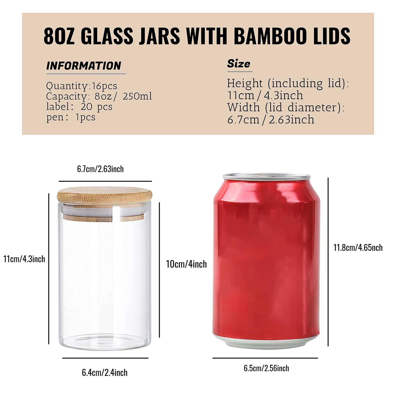 Material: These glass jars with bamboo lids are made of high-borosilicate glass, BPA free, non-toxic, which offers greater temperature resistance for long-lasting use. Freezer and microwave safe. Airtight Lid: The lids of this 8 oz glass jars with wood lids made of high quality natural bamboo, with all-round food grade silicone sealing loop, creates an airtight and moistureproof environment to keep your contents fresh and dry. Easy To Clean: The straight side and the wide mouth of the glass containers with bamboo lids allows easy accessibility to the bottom of the jar for an easy and thorough cleaning by no matter dishwasher or hand with a sponge. They are not only suitable for storing dry ingredients such as flour, sugar, coffee, spices, seeds, grains, cookies, cereal, snacks, tea and more, but also for storing arts and crafts. Glass jars with bamboo lids set These glass storage containers for pantry set offer a healthy and easy way for you to store spice or organize your pantry. The Advantages of Our Glass Containers With Bamboo Lids 1. The set contains 16 PCS of 8 oz glass jars with wood lids to meet your daily storage needs. 2. Made of high-borosilicate glass and natural bamboo, BPA free and durable for lasting long 3. 4. Easy to clean, keeping things organized to avoid a mess. Airtight lids help keep your contents fresh and dry. Specifications: Name: glass containers with bamboo lids Size: 8 oz Material: food grade glass and natural bamboo Color: clear Type: Straight side Mouth diameter:2.48 inches Height( without Lid ): 3.86 inches Bottom diameter: 2.48 inches Package included: 16 x glass jars with bamboo lids 1 x White Marker Pen 20 x Black Stickers