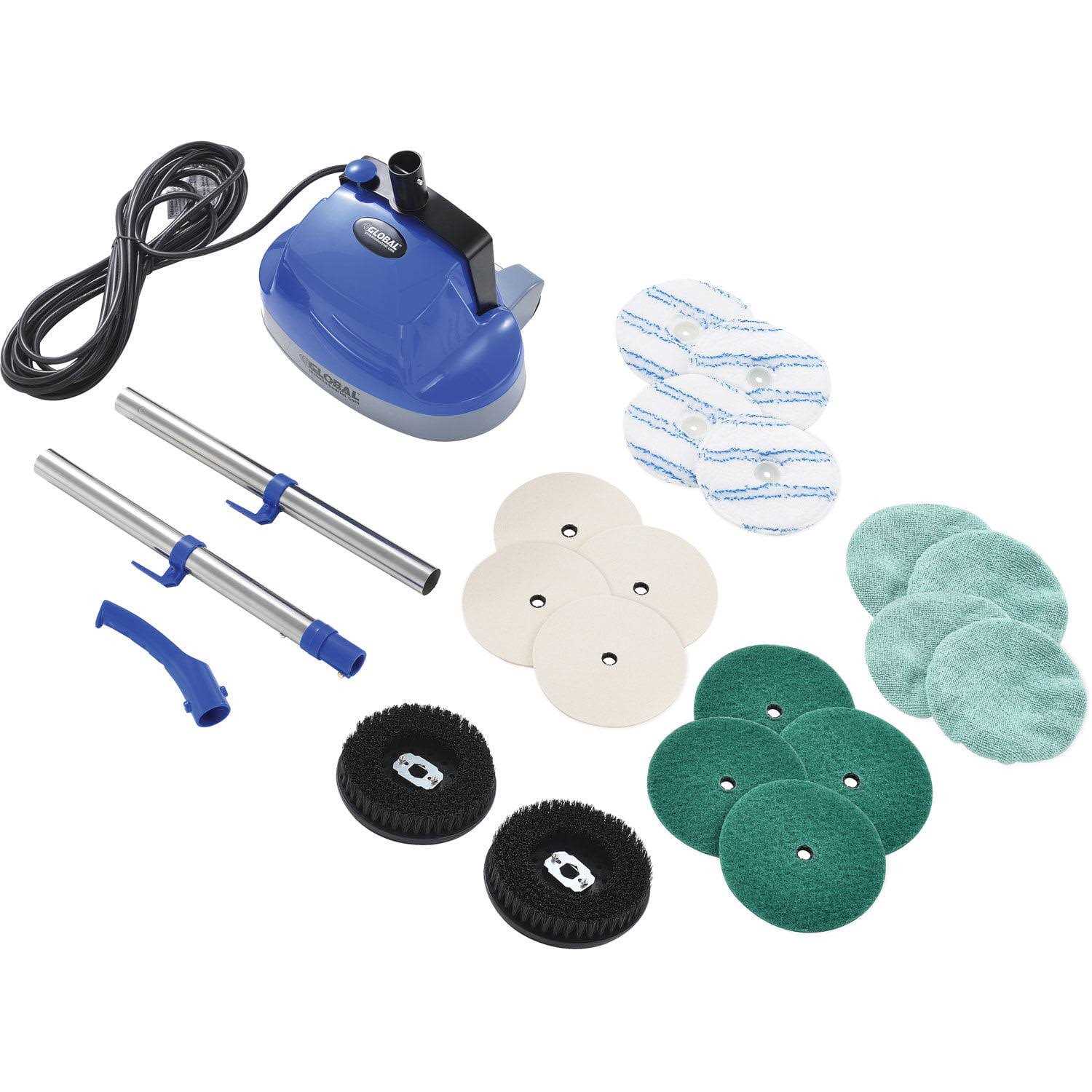 Quickly cleans and polishes tile, wood, marble and other hard floors, and can also be used to clean carpets when used with carpet bonnets, included. The dual counter rotating nylon scrub brushes are ideal for deep cleaning of grout, tile and heavier soils. The lightweight and compact design is ideal for cleaning in tight areas, such as around obstacles and fixtures. The 25′ power cord allows the user to operate the scrubber without needing to change outlets often. 11 cleaning path. Can be used with general purpose cleaning spray sold separately.