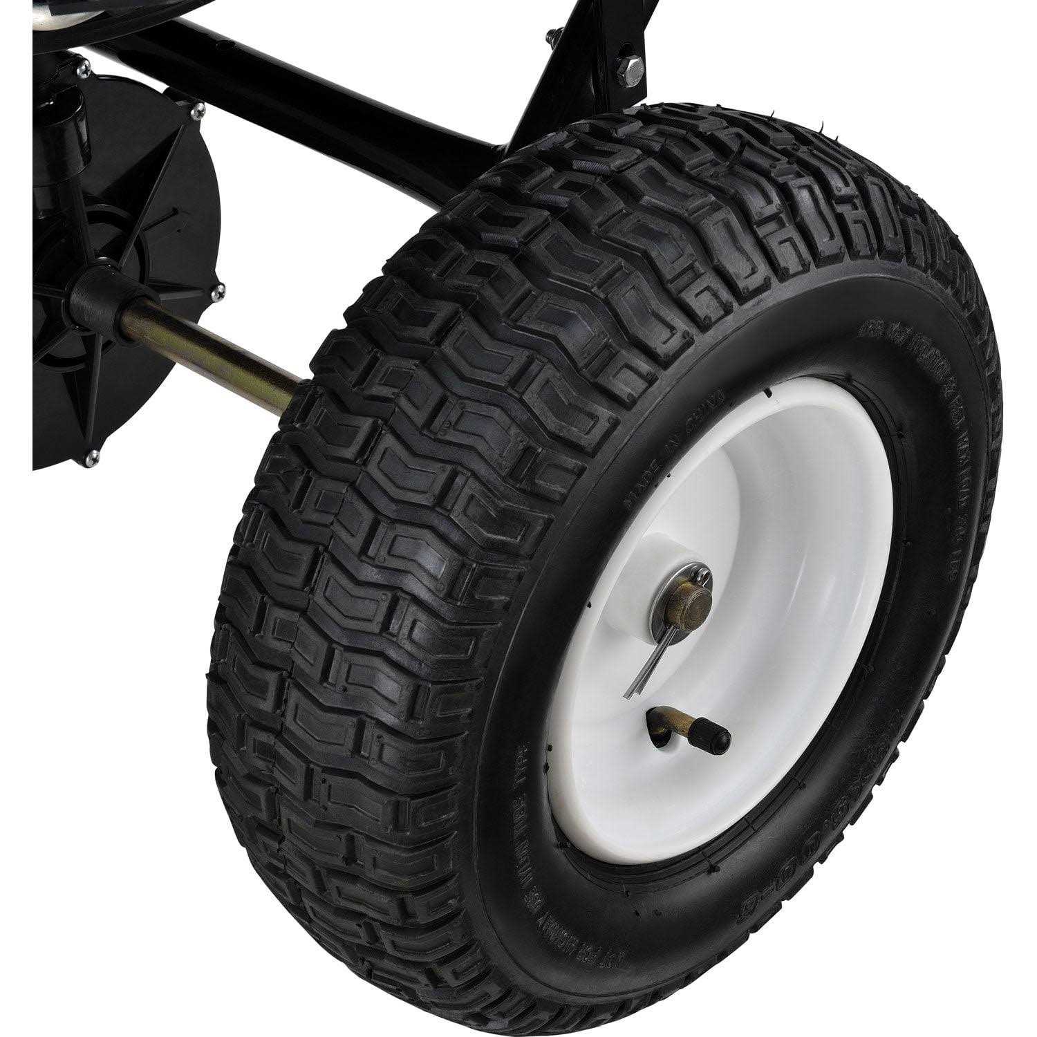 Capacity Universal Spreader is ideal for spreading seed, fertilizer, lime, ice melt, salt, and similar materials. Spreader features a welded steel frame and large 100 lb. capacity plastic hopper with screen that helps prevent materials from jamming. Comfort grip handle with flow regulator for ease of use. Large 13″ pneumatic tires make pushing through grass, slush, and ice easy. Adjustable Spread Radius 3′ to 30′. The 3-flap adjustable deflector controls spread pattern, while the rear deflector protects the operators feet. Includes plastic cover to protect materials from rain, wind, and other elements. Blue color finish. Easy assembly. Overall dimensions 40″L x 27″W x 32″H.