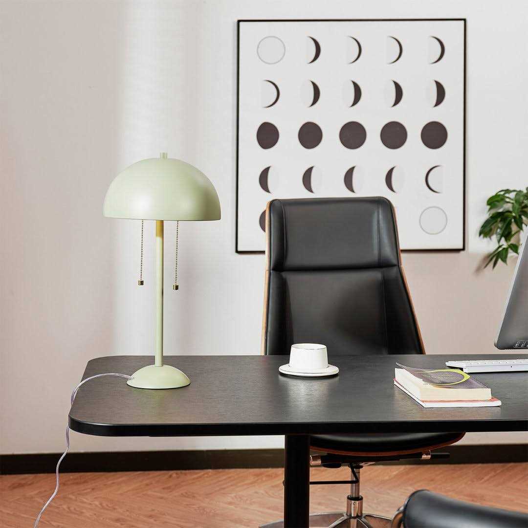 Novogratz x Globe Electric The chic dome shade, two-light feature, and double brass pull chain of this 2-Light Table Lamp are fun, sophisticated, and vintage. This table lamp is the ideal accent piece for any millennial-style living room, bedroom, or office for a flawless retro design trend and brings just the right amount of glamour to your space. The sage green colour of the metal shade with brass accents sits in the grand millennial mind frame and pairs perfectly with any existing decor in your home.