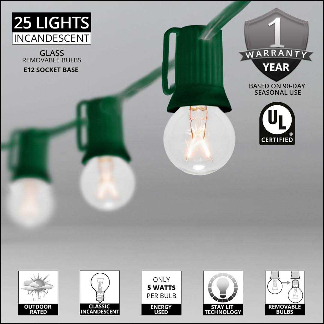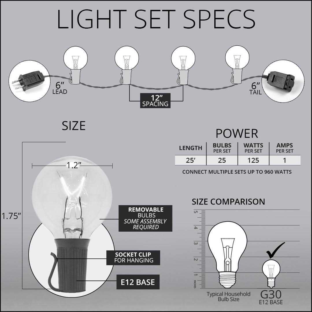 Enhance your outdoor decor with globe lights. Commercial quality clear G30 patio lights are long lasting and weather resistant, providing hours of professional display throughout any season. Light strings featuring 12″ bulb spacing are a popular option for creating flawless coverage in any space and green wire blends perfectly against natural settings. Drape these classic patio lights above an outdoor living room, across a fence, or up against walls for an elegant, timeless look.