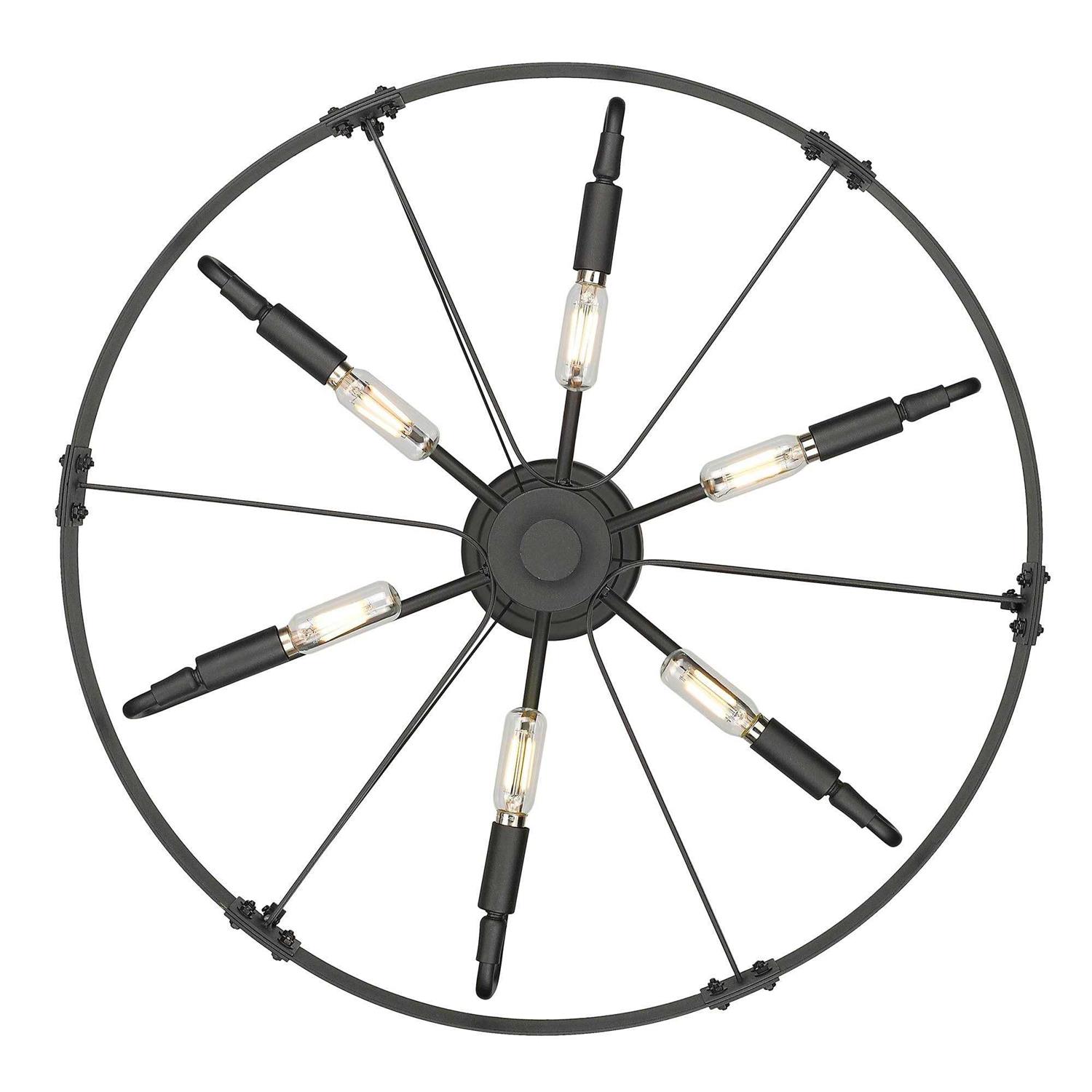 Industrial by nature, Vaughn fits well in contemporary homes. Inspired by the spokes of a vintage wagon wheel, this collection brings antiquity to the modern age. The Natural Black finish is slightly textured and adds drama to this focal series. Select a monochromatic version or elevate the look by selecting a fixture with contrasting aged brass accents. Pivoting sockets and steel cables act as additional features to the bold design.