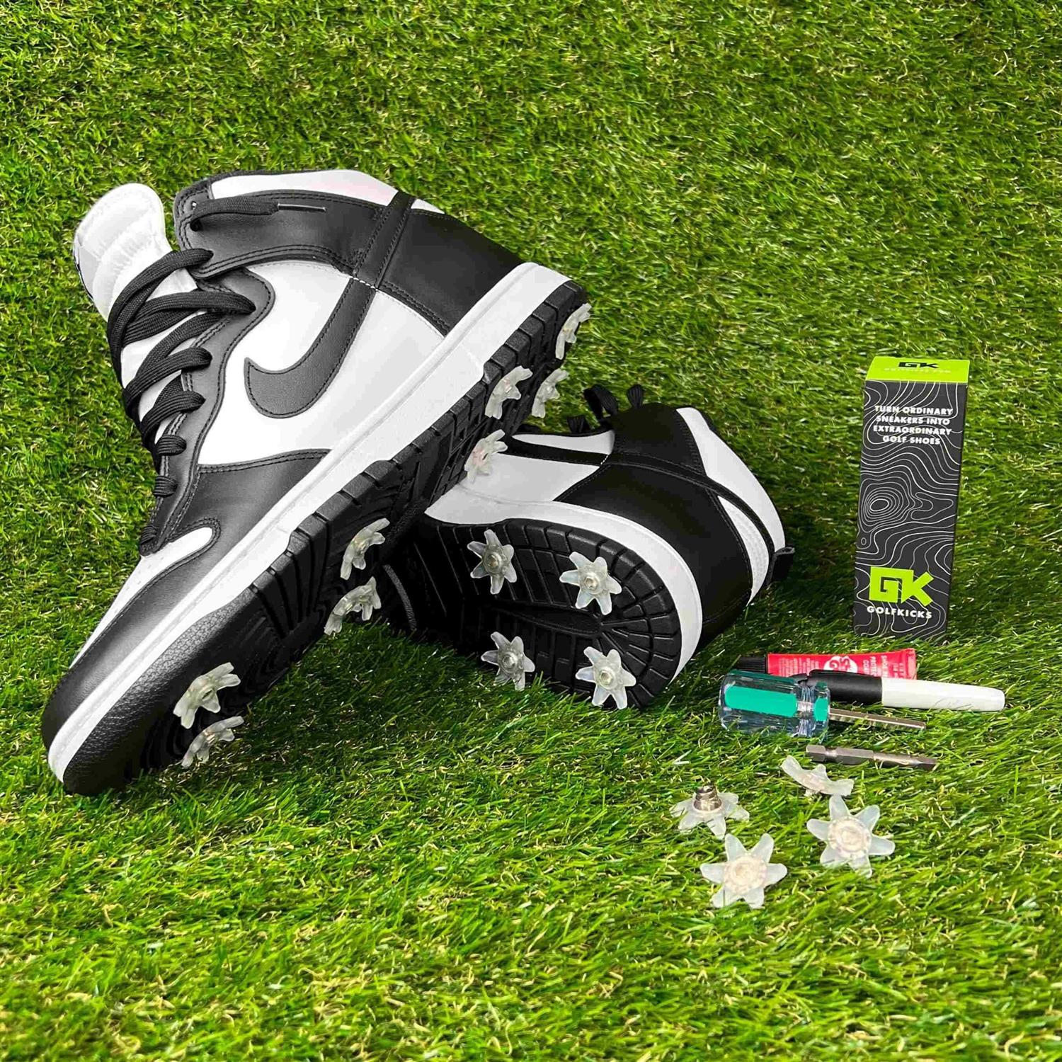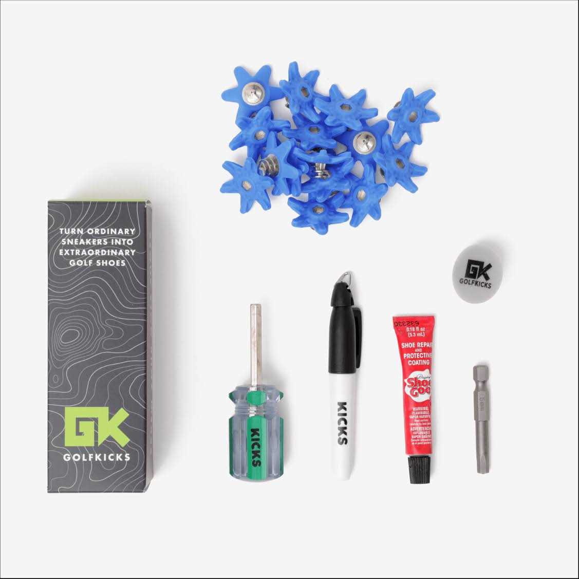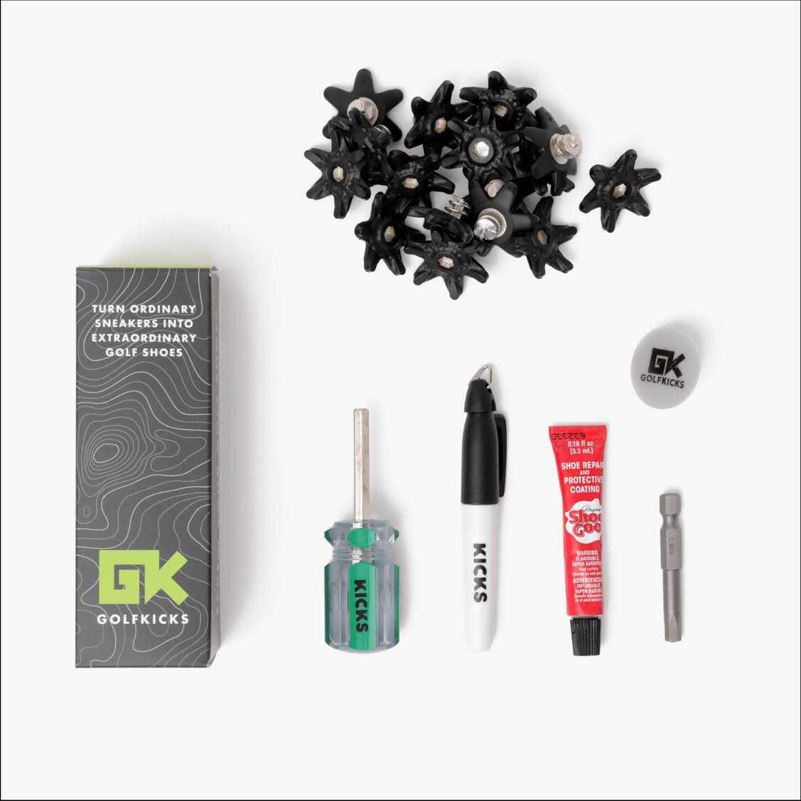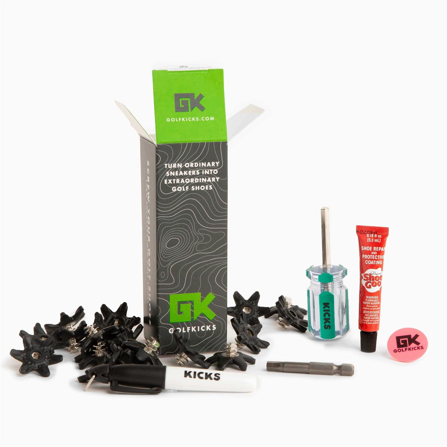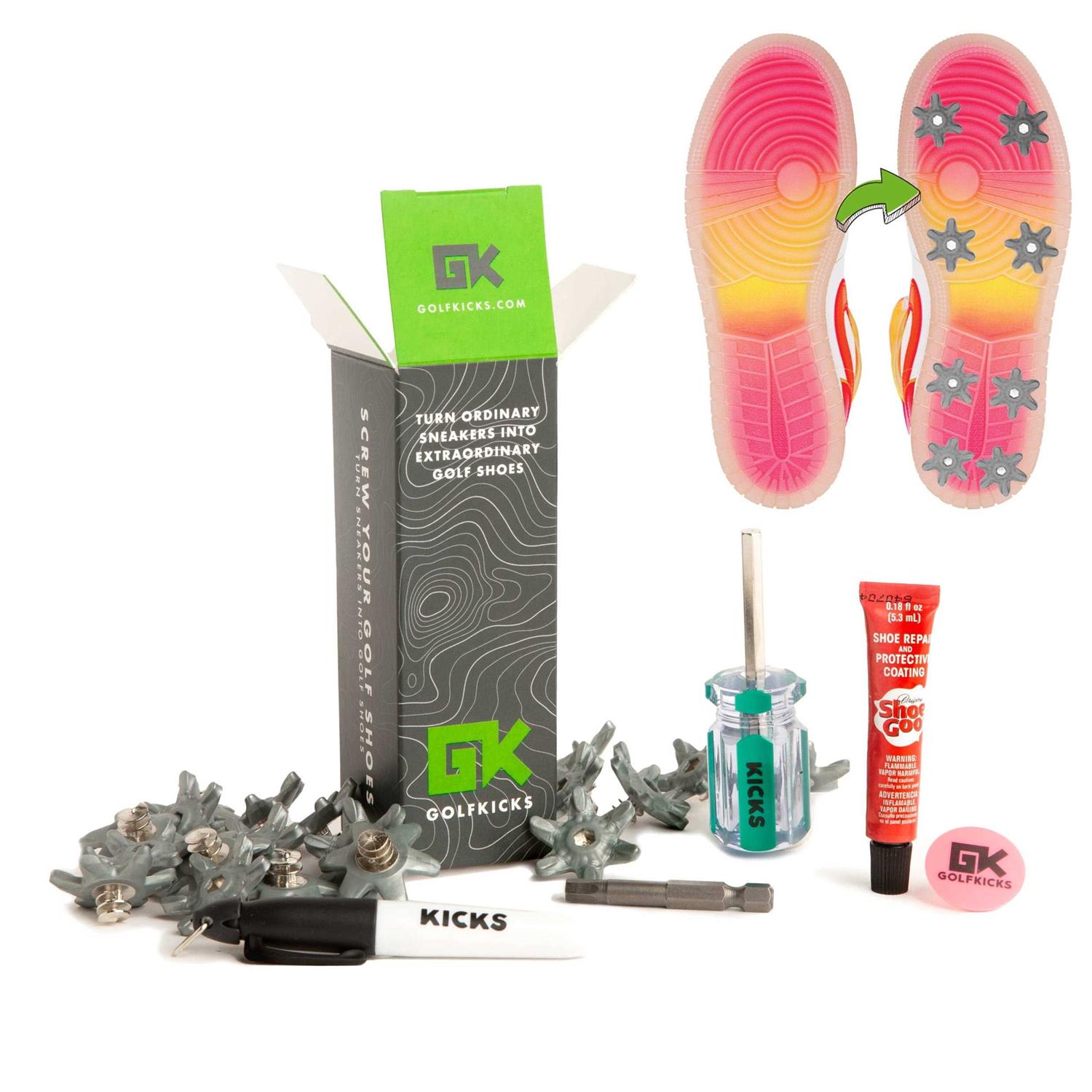 Spikes by Golfkicks. Details:Transform any sneakers into golf shoes – The Golfkicks adventure began in a Denver garage with three friends who had trouble finding cool, comfortable golf shoes. Our durable cleats let you hit the green in style and comfort with easy-to-install, professional-grade traction. Kit includes: (20) Cleats (16 for a pair of adult-size shoes plus 4 extras), (1) marker to map traction, 1 tube of shoe goo, and (1) 5mm HEX installation tool.