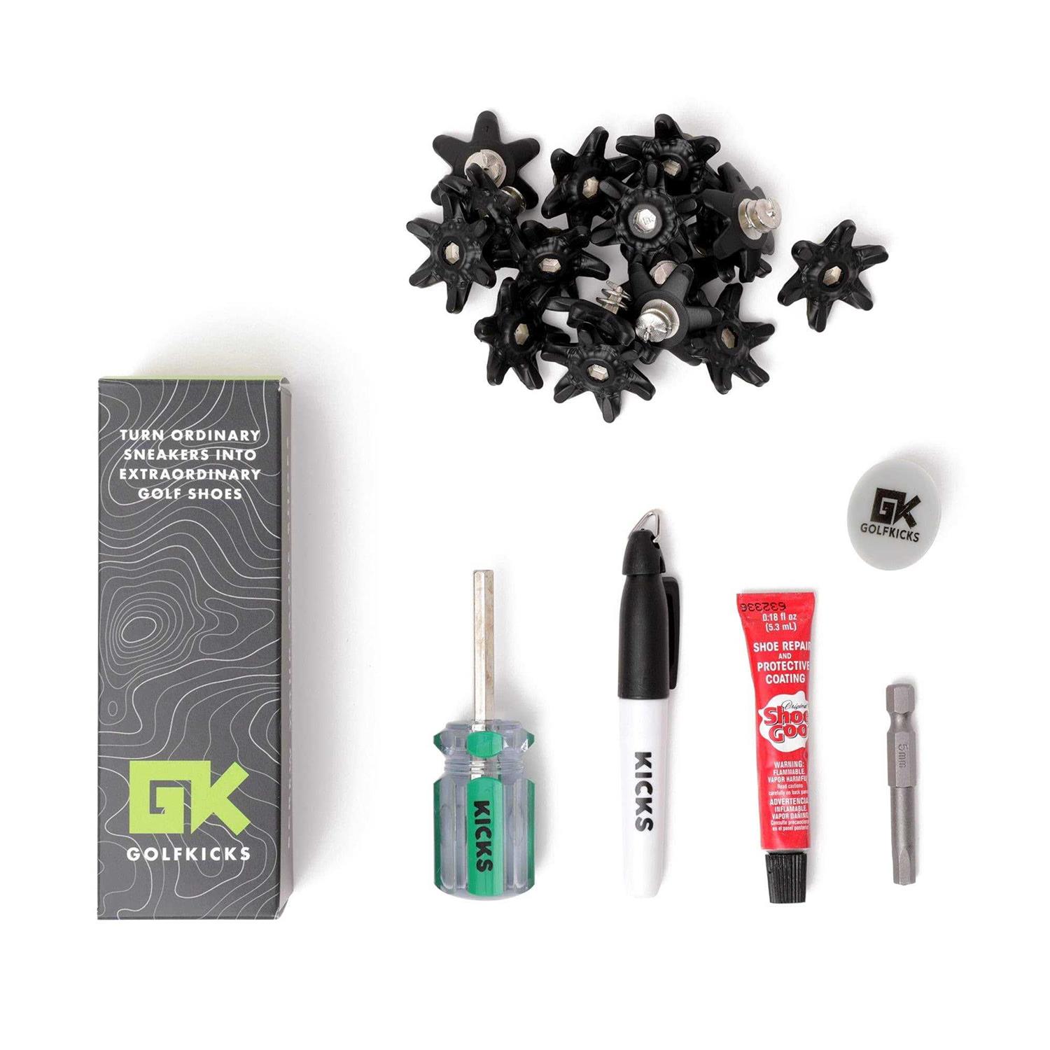 Spikes by Golfkicks. Details:Transform any sneakers into golf shoes – The Golfkicks adventure began in a Denver garage with three friends who had trouble finding cool, comfortable golf shoes. Our durable cleats let you hit the green in style and comfort with easy-to-install, professional-grade traction. Kit includes: (20) Cleats (16 for a pair of adult-size shoes plus 4 extras), (1) marker to map traction, 1 tube of shoe goo, and (1) 5mm HEX installation tool.