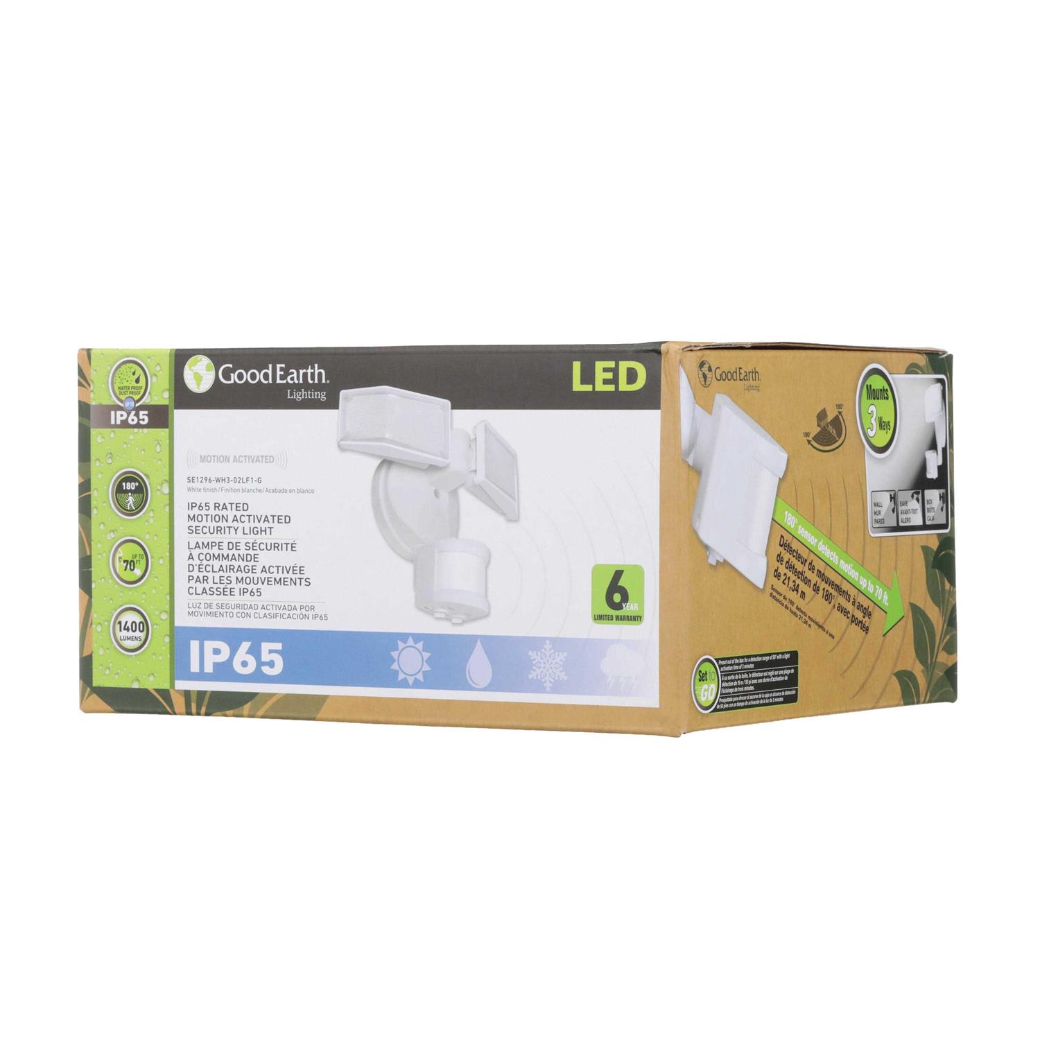 The Good Earth Lighting 2-Head Hardwired Motion Activated security light provides safety and security by illuminating dark areas such as backyards and driveways. The sturdy polycarbonate housing with a shatter-resistant diamond-patterned diffuser lens provides a smooth and even light distribution. The Set To Go feature sets the light with a 3-minute timer and 50-ft distance out of the box, no testing is needed The IP65 rating makes it ideal for outdoor wet locations and cold weather rated with a minimum cold start temperature of -20 degrees. The built-in timer and distance control settings can be customized to meet a variety of lighting customizations. Maximize energy savings and discourage intruders from coming near the home.