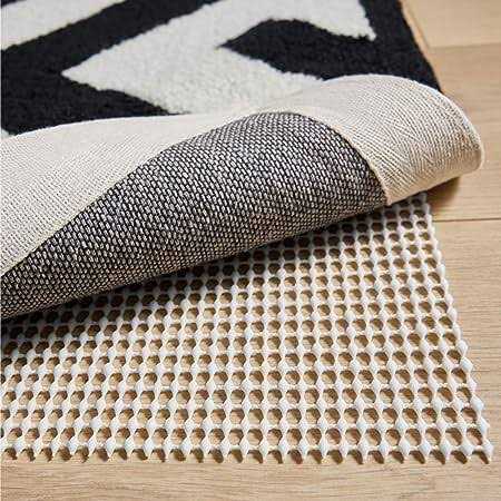 THE ORIGINAL EXTRA STRONG GRIPPER: our trusted Gorilla Grip nonadhesive rug pads offer a unique, dual sided grip that firmly holds onto both the rug pad and your hard floor to help prevent rug movement REDUCES RUG BUNCHING AND SLIDING: slip resistant pads help reduce rug bunching and sliding, even over high traffic areas in your home; the ideal option for homes with kids and pets SUPERIOR FLOOR PROTECTION: open grid design allows floors to breathe and helps protect from damage; rug pads are reversible, vacuum friendly, and constructed from premium materials THICK AND LONG LASTING CUSHIONING: thick cushioning adds extra comfort helping to make rugs cozier and softer under foot; rug pads also help reduce everyday noise in busy areas; constructed of premium materials for long lasting quality to help keep rugs in place for years to come EASY INSTALLATION, TRIM TO SIZE: available in the most popular sizes for easy installation, this pad measures 2.5 feet by 13 feet; easily trim pad with scissors for unique sizes and shapes; put the pad down, place the rug on top and trim off any excess material Tired of straightening your area rugs day after day? Here is what makes ours so effective: br br CAN THIS HELP WITH MY RUG BUNCHING? Yes, this skid-resistant rug pad for hard floors helps locks rugs in place. It also helps with moving and bunching. br br DOES IT PROVIDE FLOOR PROTECTION? Of course. The open grid construction allows rugs to breath and helps to make vacuuming easier. This rug pad is also washable! br br CAN I TRIM THIS RUG PAD FOR CUSTOM SIZES? Absolutely. You can easily cut this rug pad with a household scissor to fit any non standard sized rug.