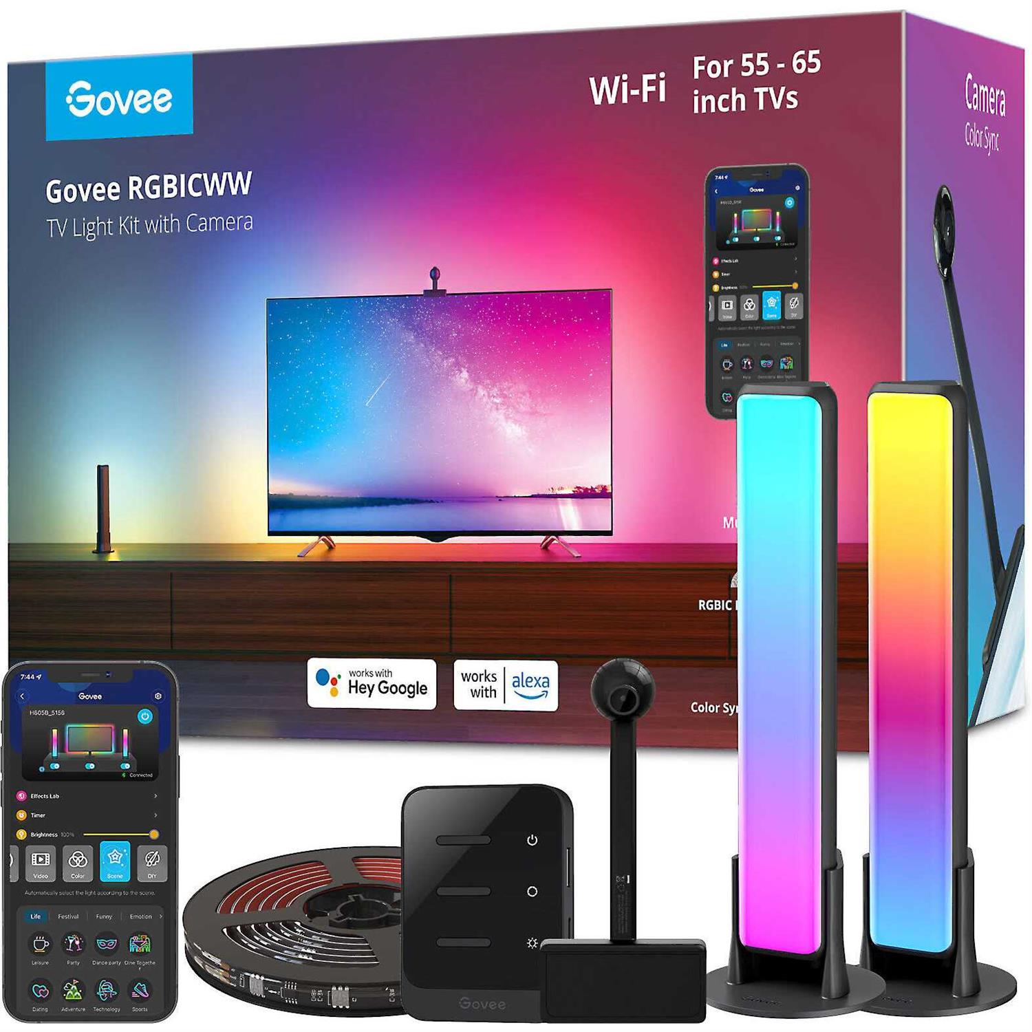 Govee Immersion Kit brings an unprecedented immersive visual experience to any home theater. Its camera and mic capture the colors, movement, and audio of your content and automatically projects real-time reactive bias lighting onto the wall behind via an RGBIC strip light and two light bars. App control with Govee Home or voice control with Alexa or Google Assistant. For 55″-65″ TVs.