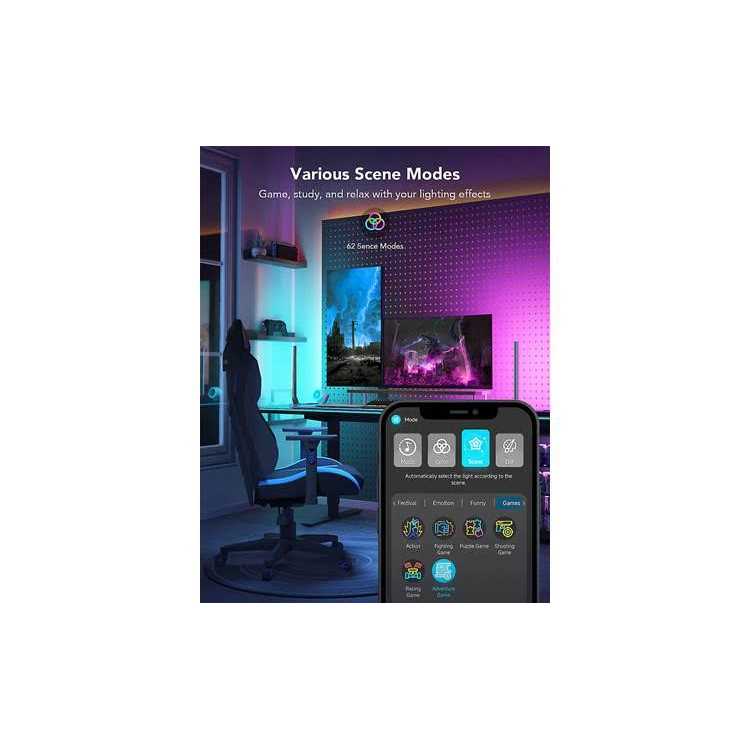 Turn up the lighting effects with a touch of the dial using Govee’s innovative gaming lightbars. Designed with gamers in mind, this cutting-edge technology reacts to the sounds of your games with over 16 million colors from the RGBIC technology. Enjoy the most advanced lighting effects while you play your favorite games.
