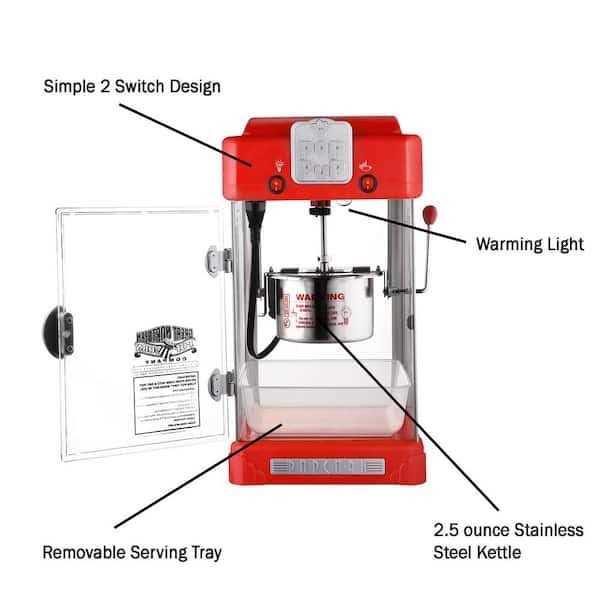 The tabletop popcorn maker includes a 2.5-ounce stainless steel kettle that makes about 1 gallon of popcorn in minutes, a warming light to keep this delicious snack fresh and a dishwasher safe removable popcorn tray to catch and serve the popcorn. The popper’s compact design is fun, nostalgic, and sure to please everyone at family movie night or as a gift for your favorite couple!. Color: Red.